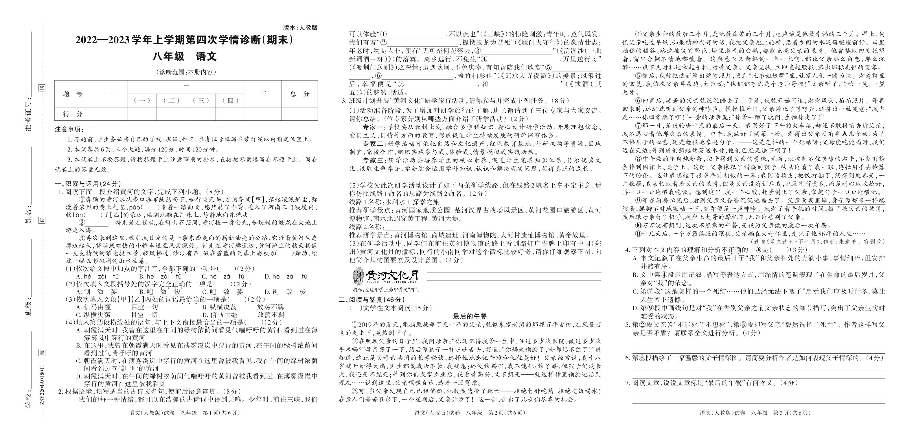 2022—2023学年上学期第四次学情诊断(期末)八年级语文(人教版)_R231012111039798