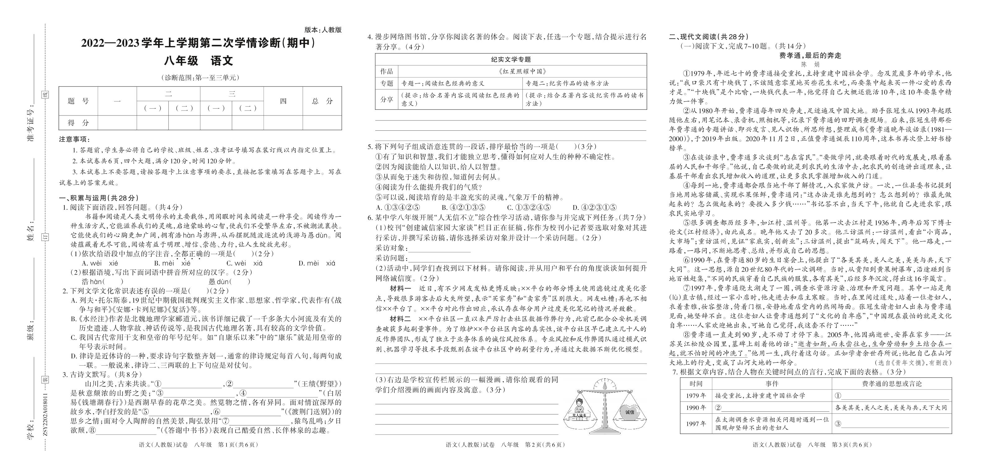 2022—2023学年上学期第二次学情诊断(期中)八年级语文(人教版)