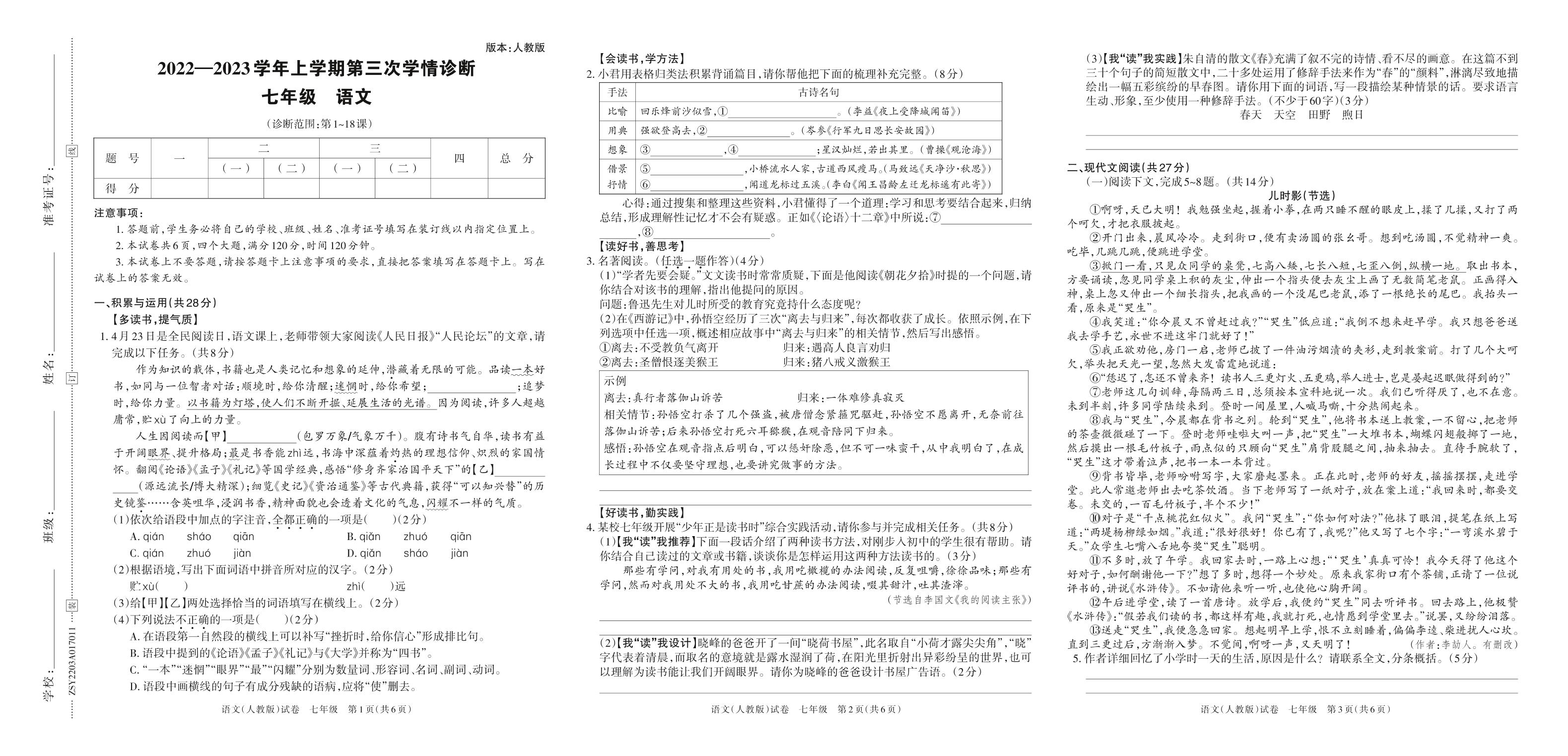 2022—2023学年上学期第三次学情诊断七年级语文(人教版)