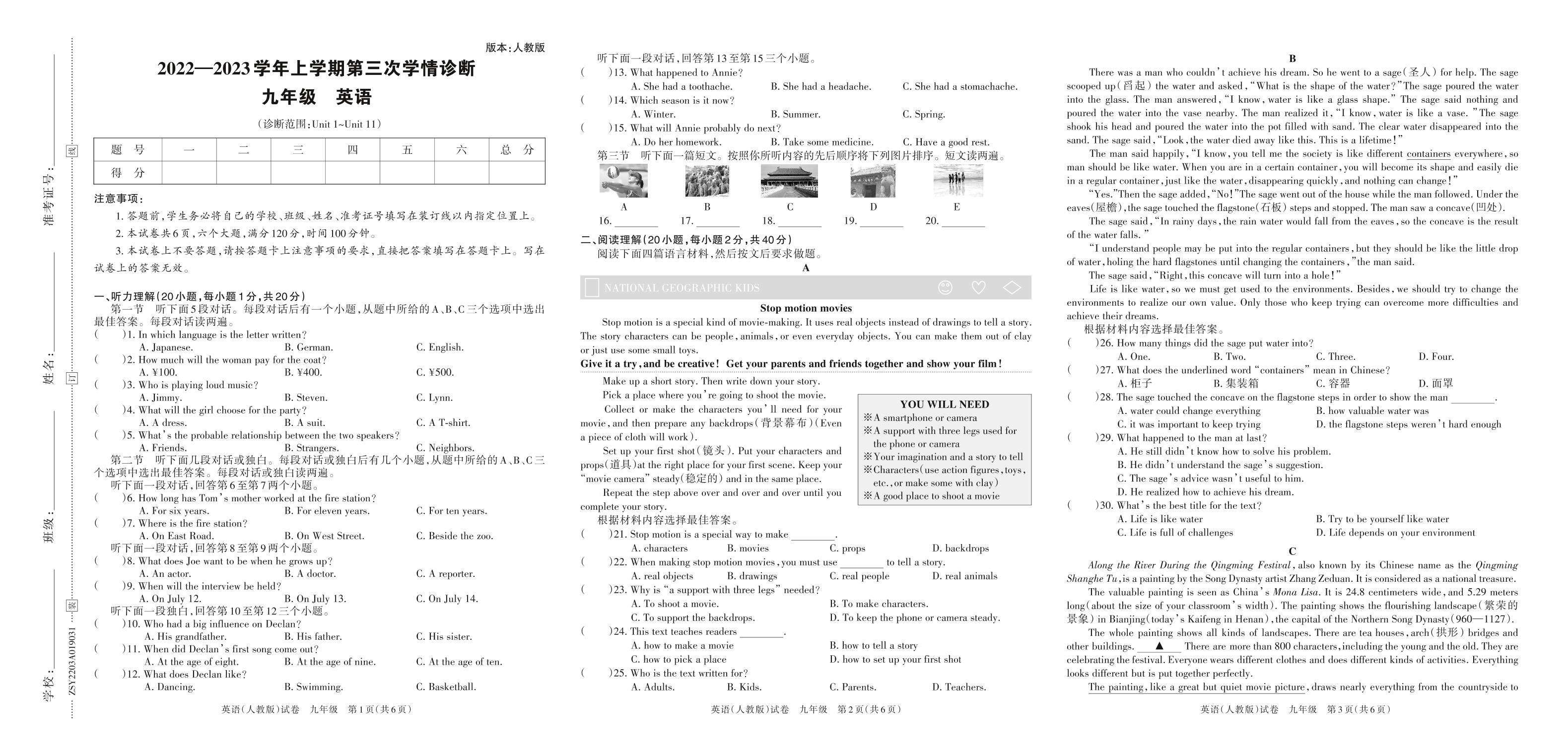2022—2023学年上学期第三次学情诊断九年级英语(人教版)