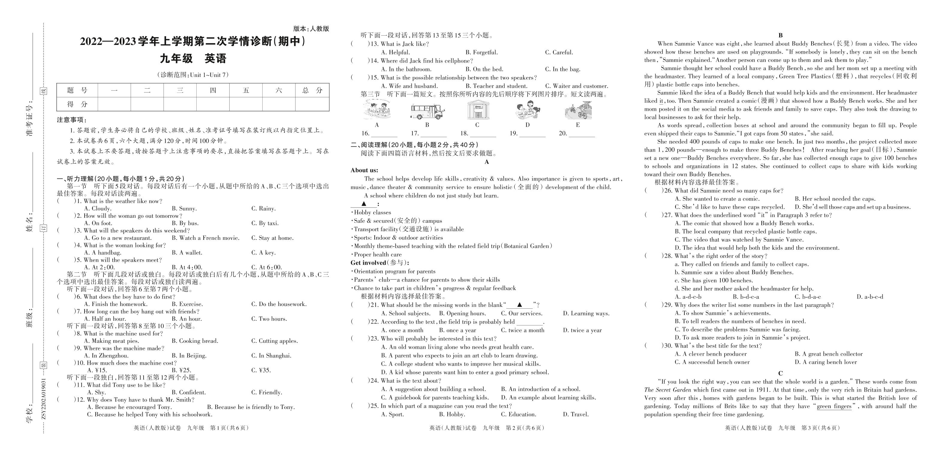 2022—2023学年上学期第二次学情诊断(期中)九年级英语(人教版)
