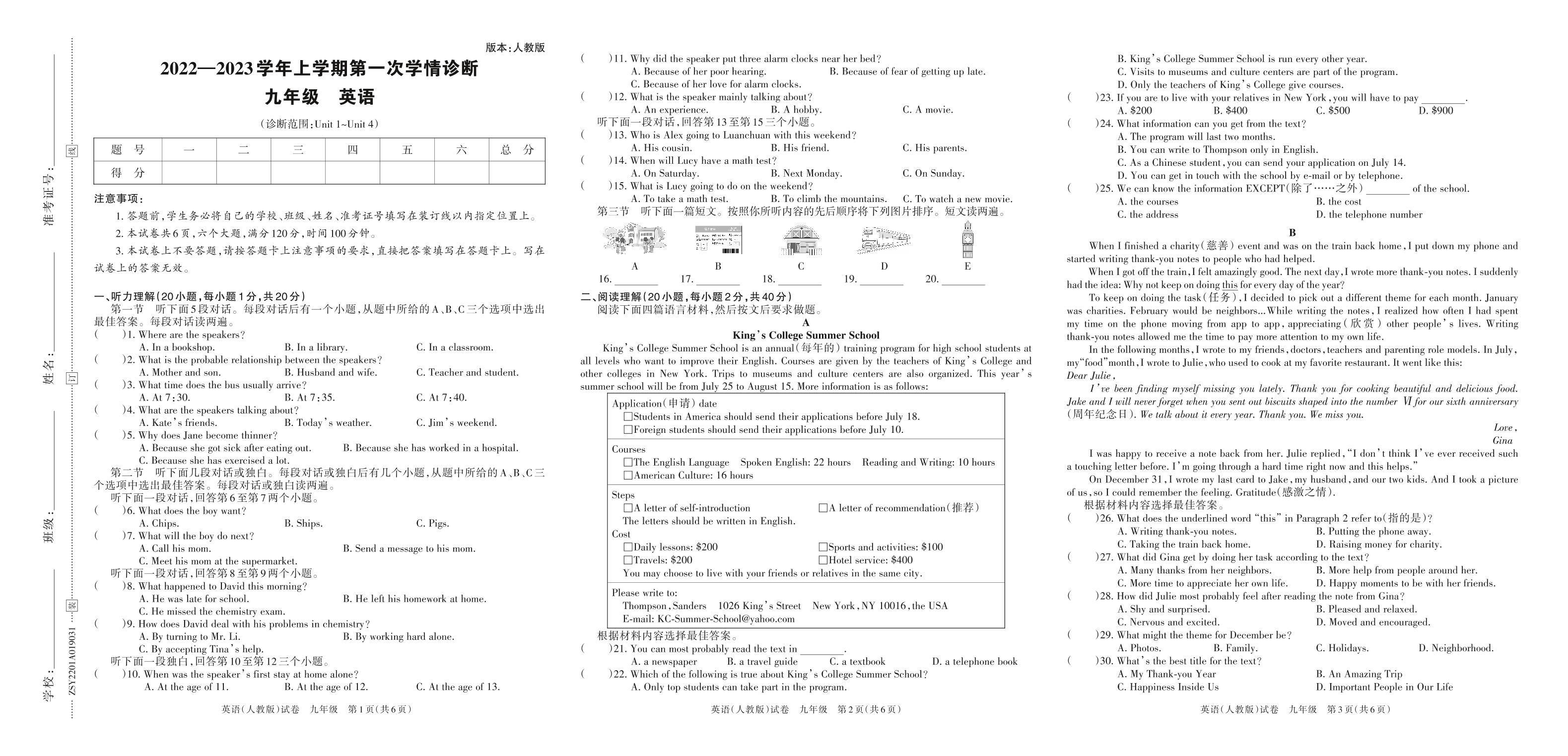 2022—2023学年上学期第一次学情诊断九年级英语(人教版)
