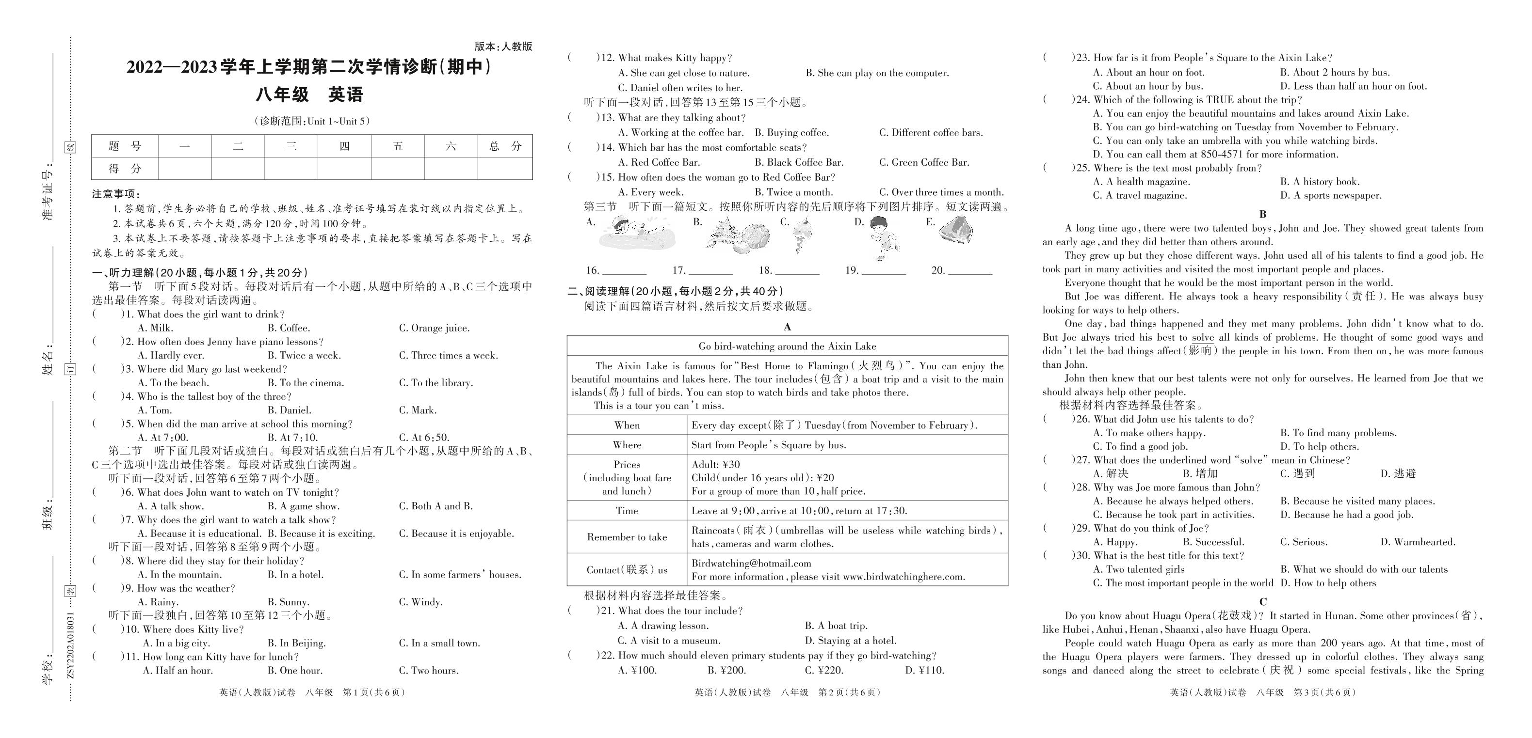 2022—2023学年上学期第二次学情诊断(期中)八年级英语(人教版)