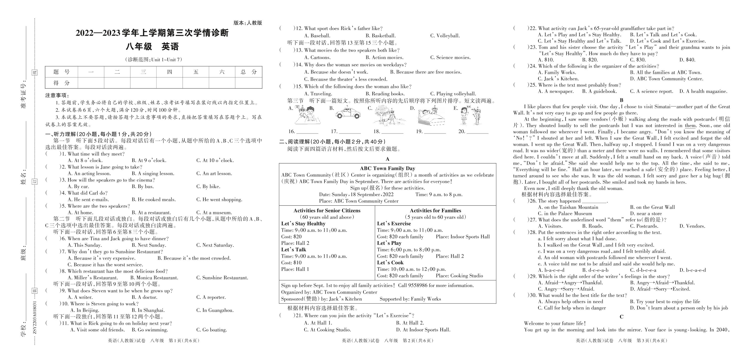 2022—2023学年上学期第三次学情诊断八年级英语(人教版)