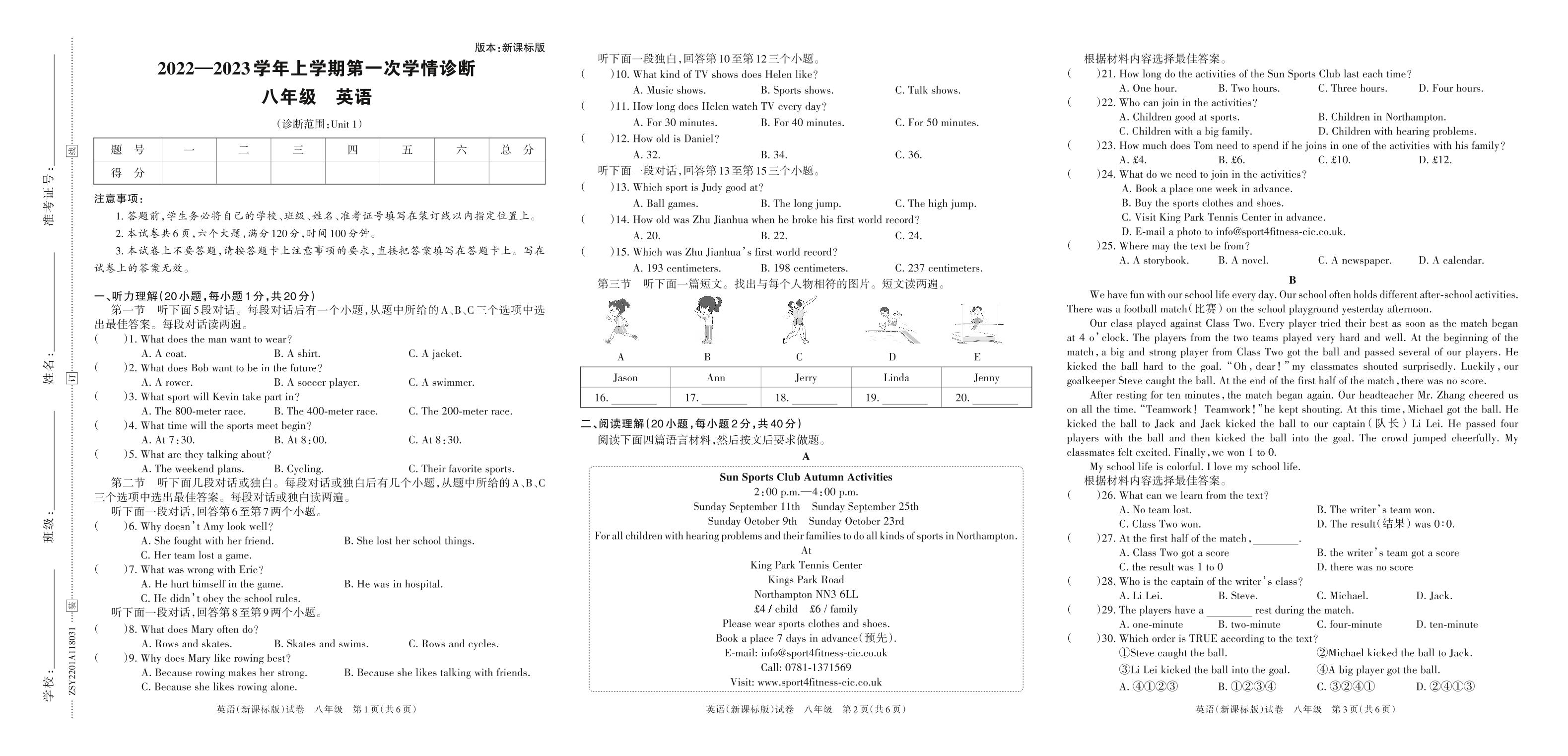 2022—2023学年上学期第一次学情诊断八年级英语(新课标版)