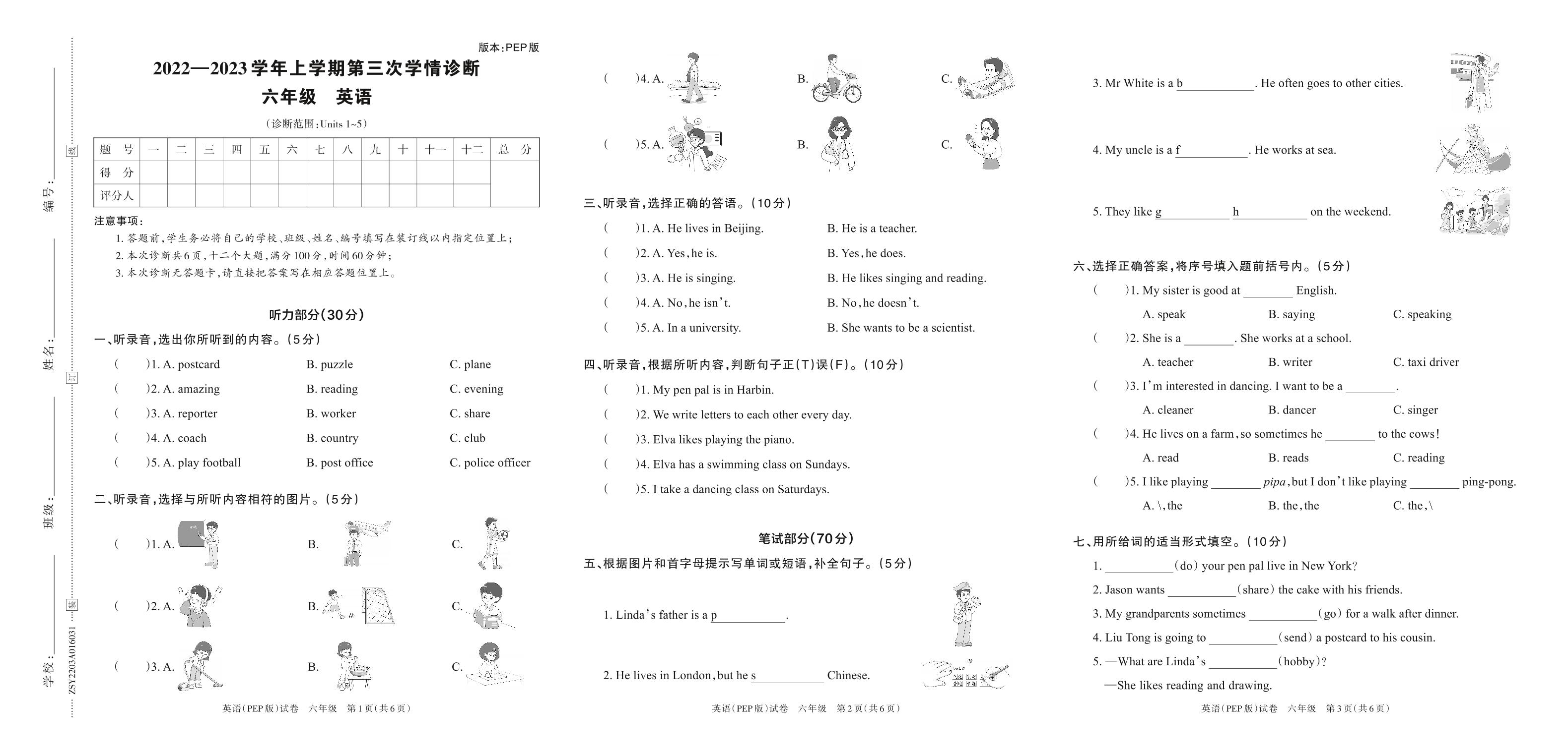 2022—2023学年上学期第三次学情诊断A卷六年级英语(PEP版)