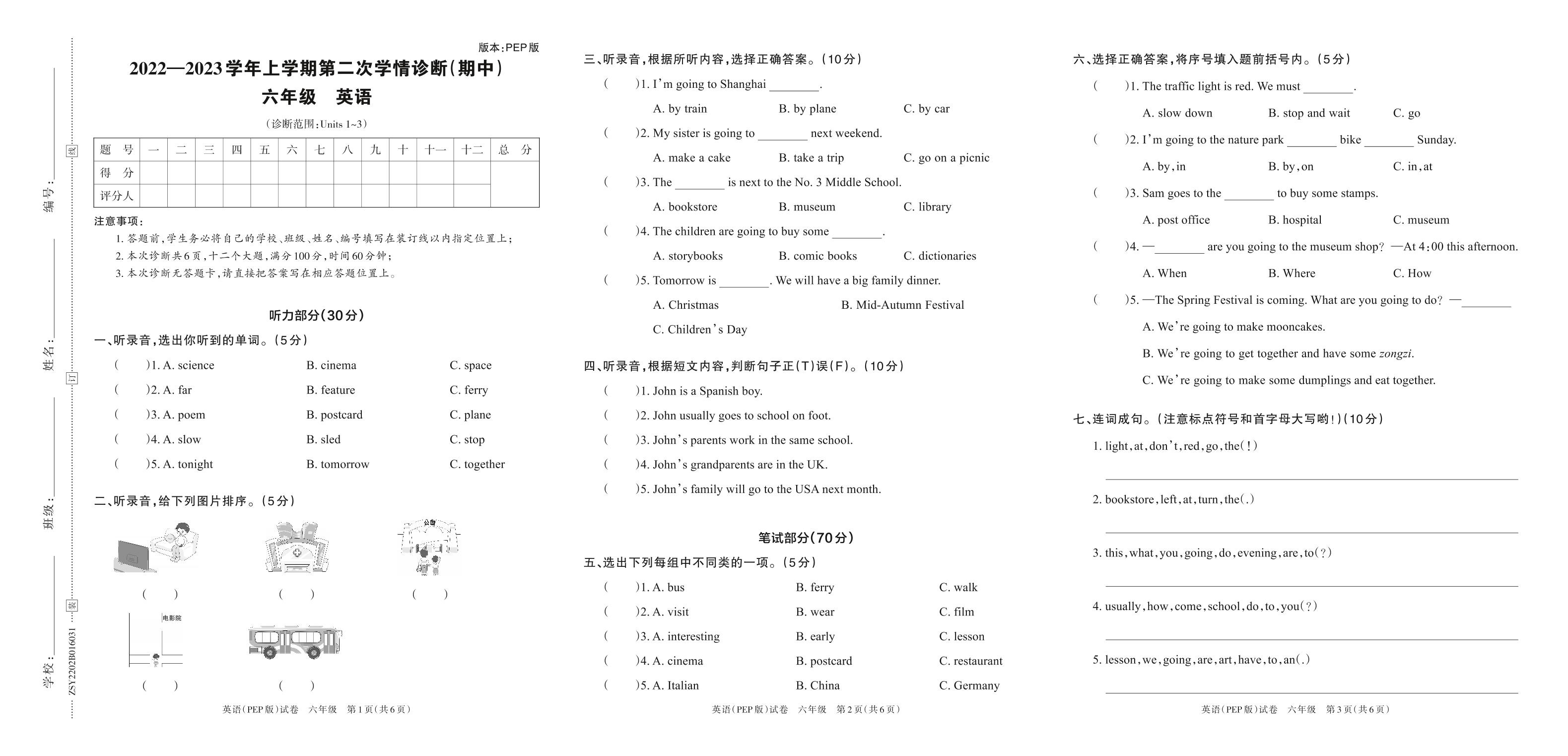 2022—2023学年上学期第二次学情诊断(期中)B卷六年级英语(PEP版)