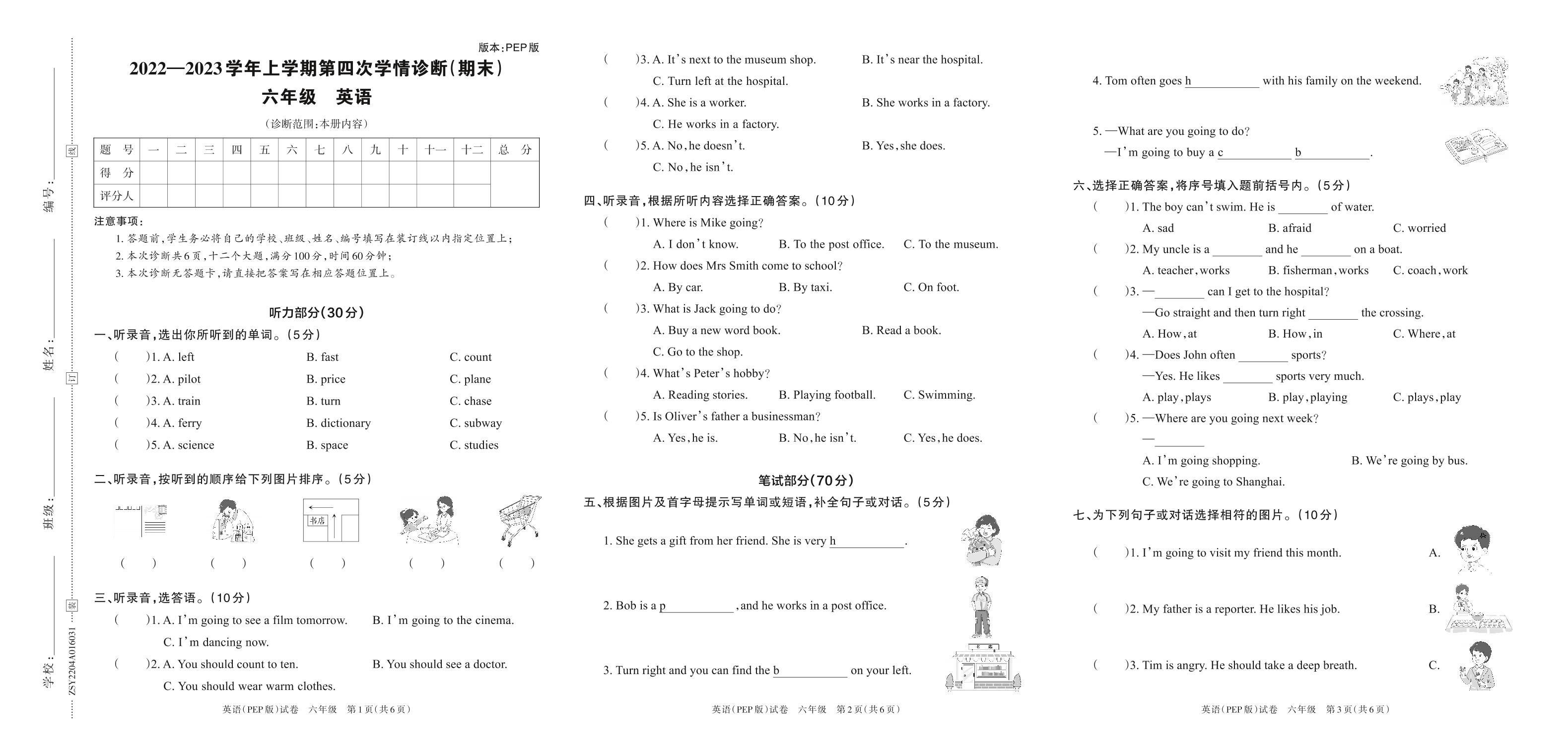 2022—2023学年上学期第四次学情诊断(期末)A卷六年级英语(PEP版)