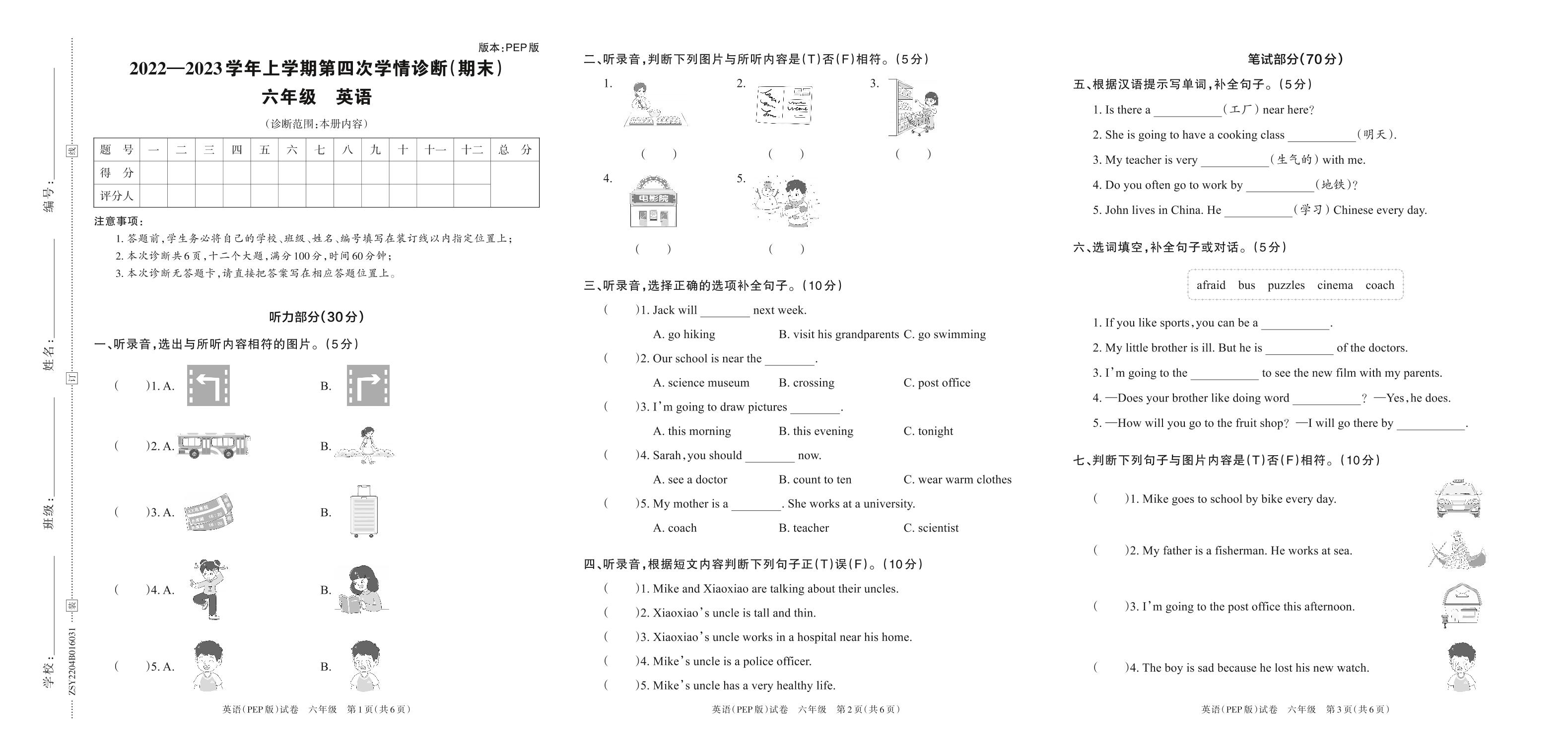 2022—2023学年上学期第四次学情诊断(期末)B卷六年级英语(PEP版)