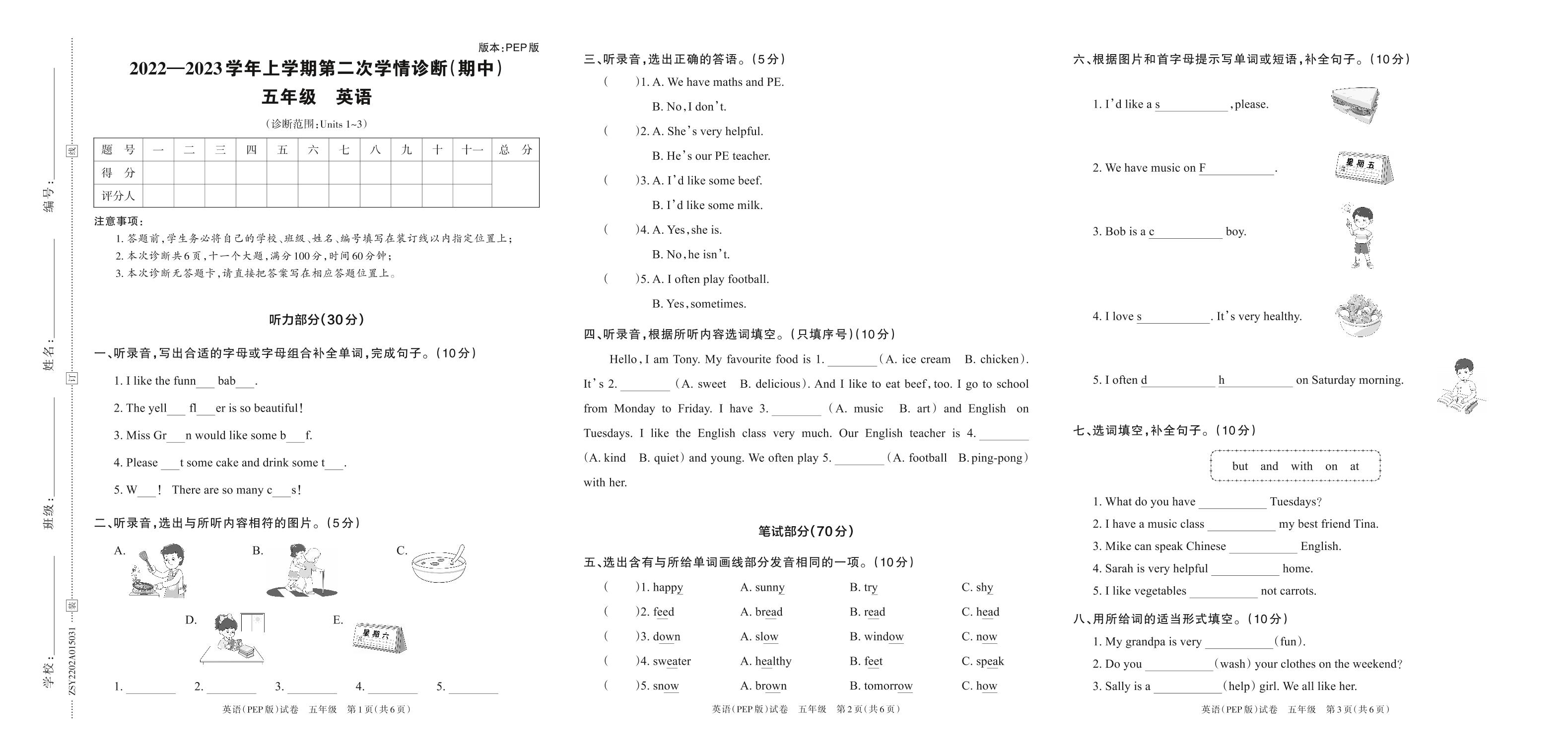 2022—2023学年上学期第二次学情诊断(期中)A卷五年级英语(PEP版)