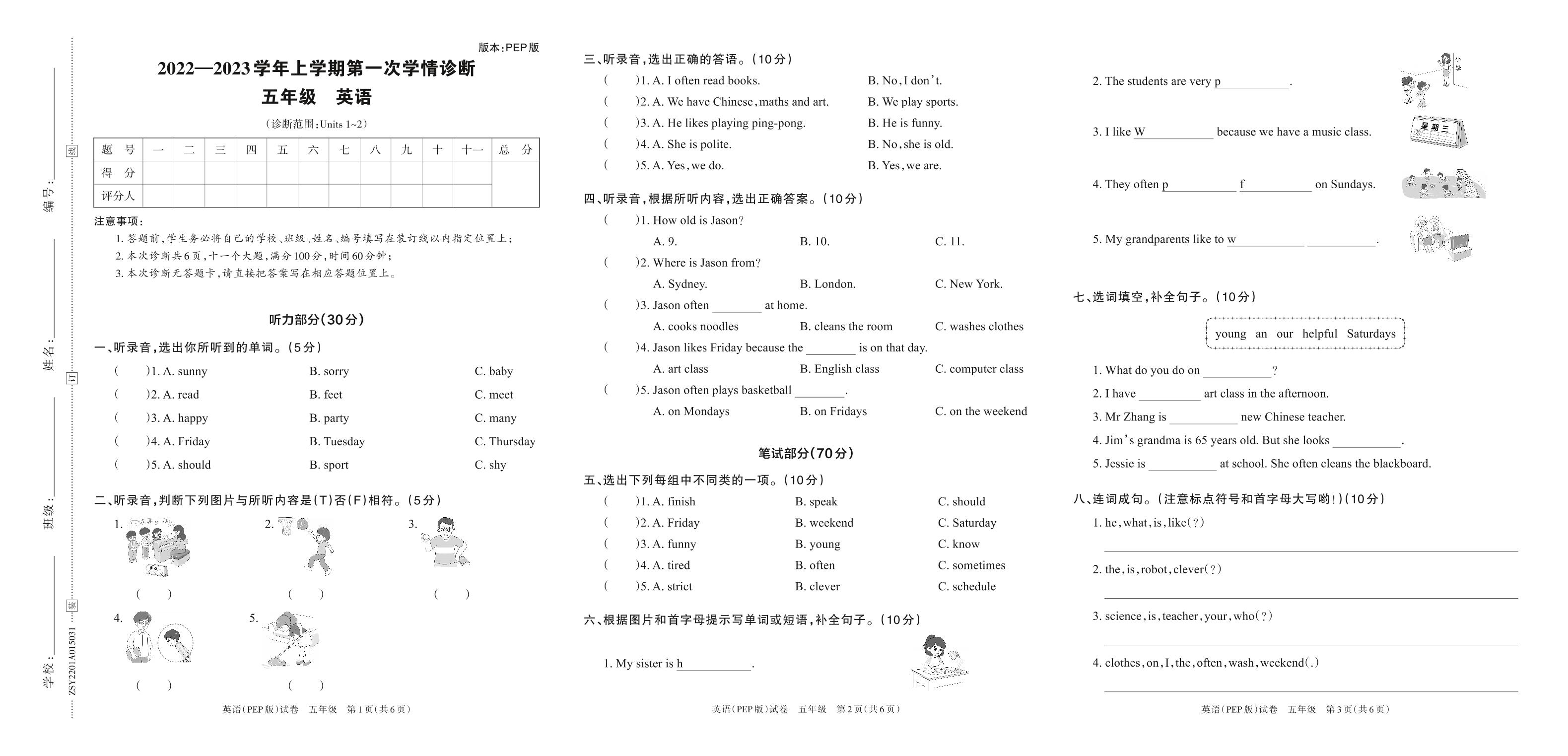2022—2023学年上学期第一次学情诊断A卷五年级英语(PEP版)