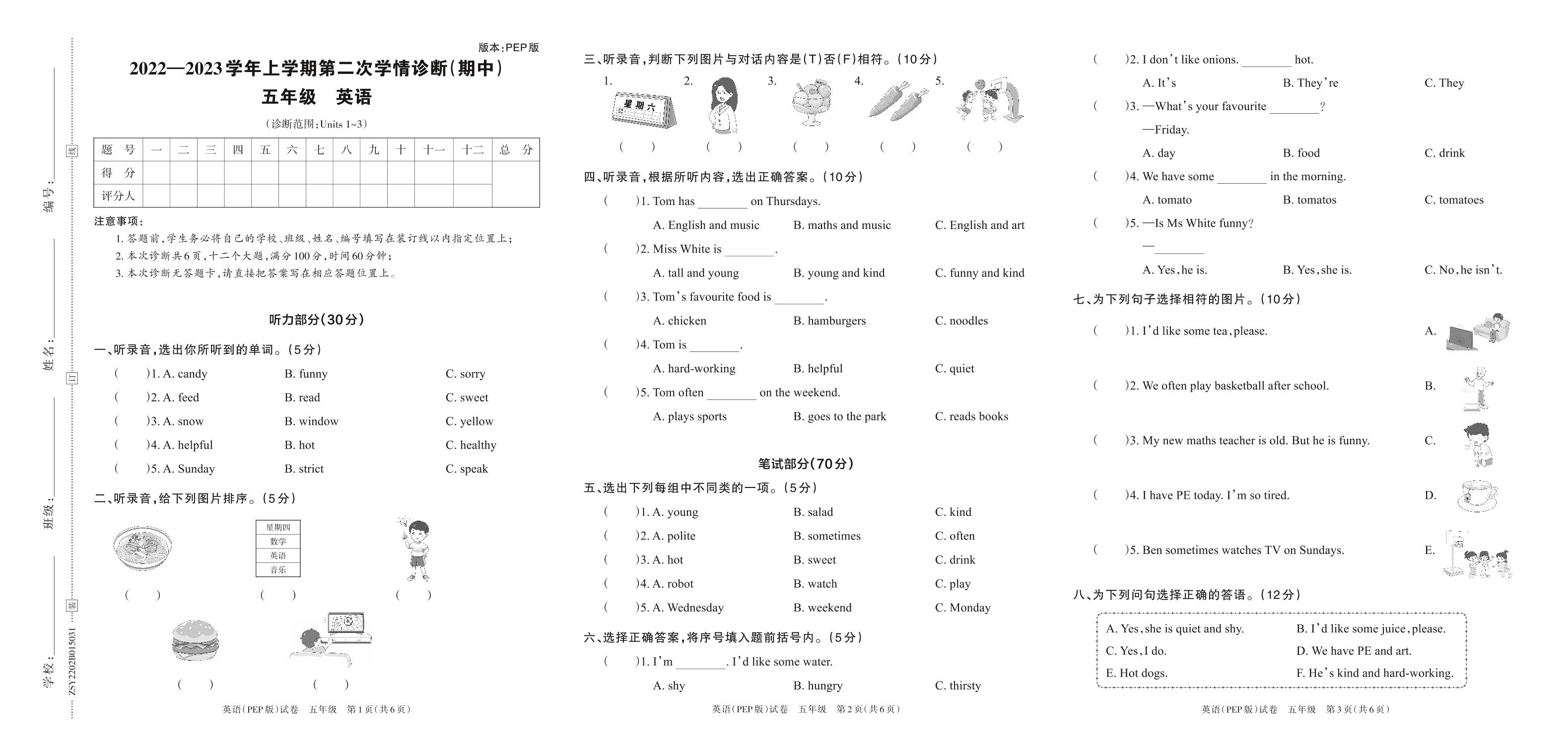 2022—2023学年上学期第二次学情诊断(期中)B卷五年级英语(PEP版)