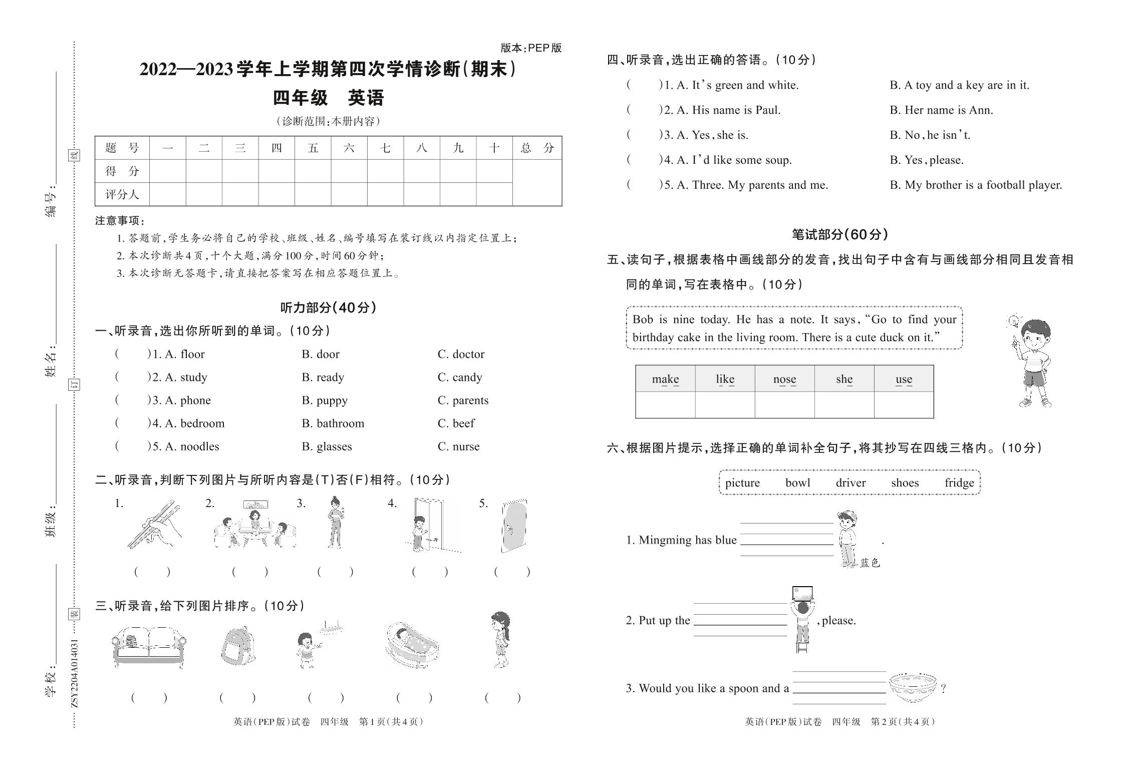 2022—2023学年上学期第四次学情诊断(期末)A卷四年级英语(PEP版)