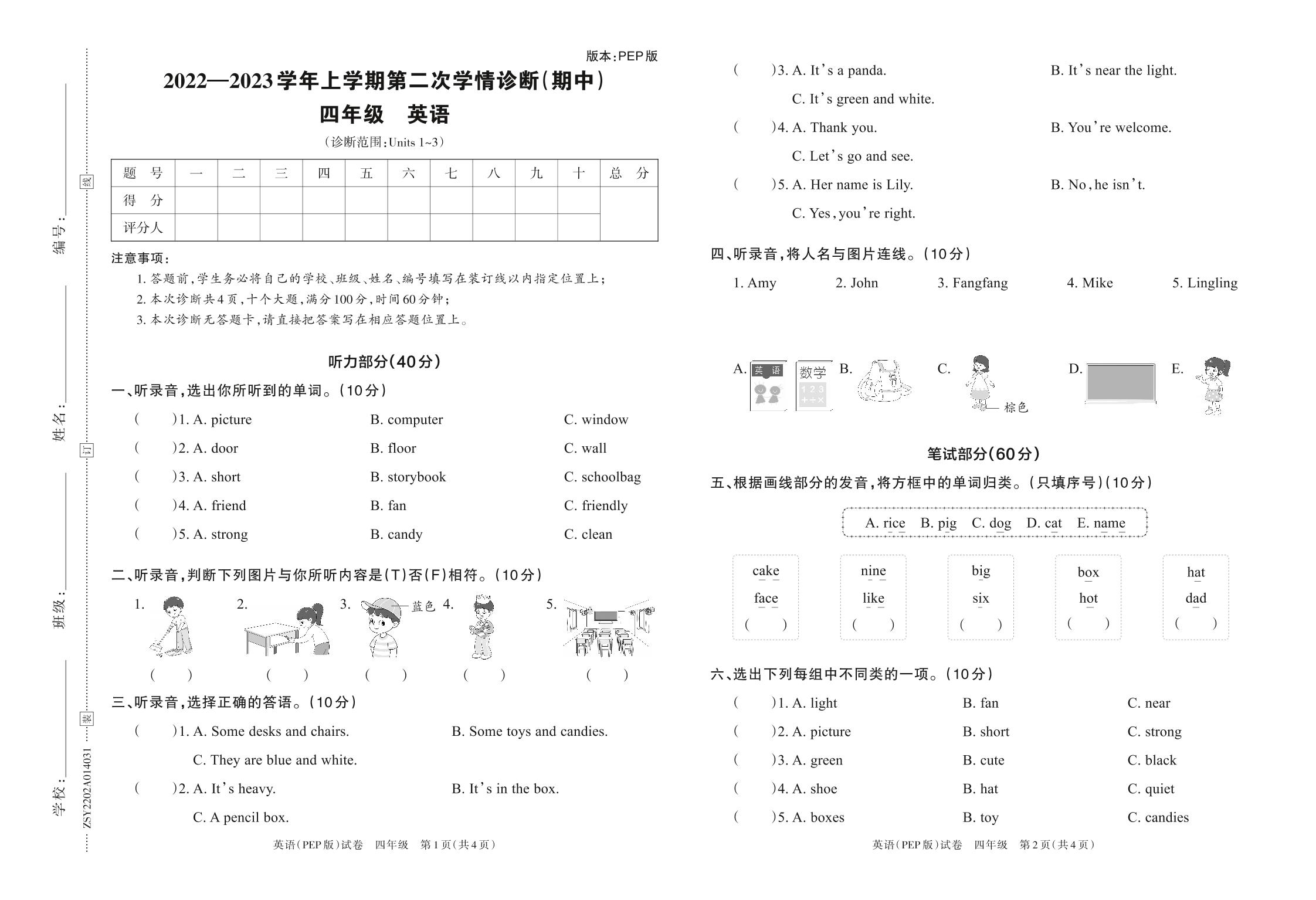 2022—2023学年上学期第二次学情诊断(期中)A卷四年级英语(PEP版)