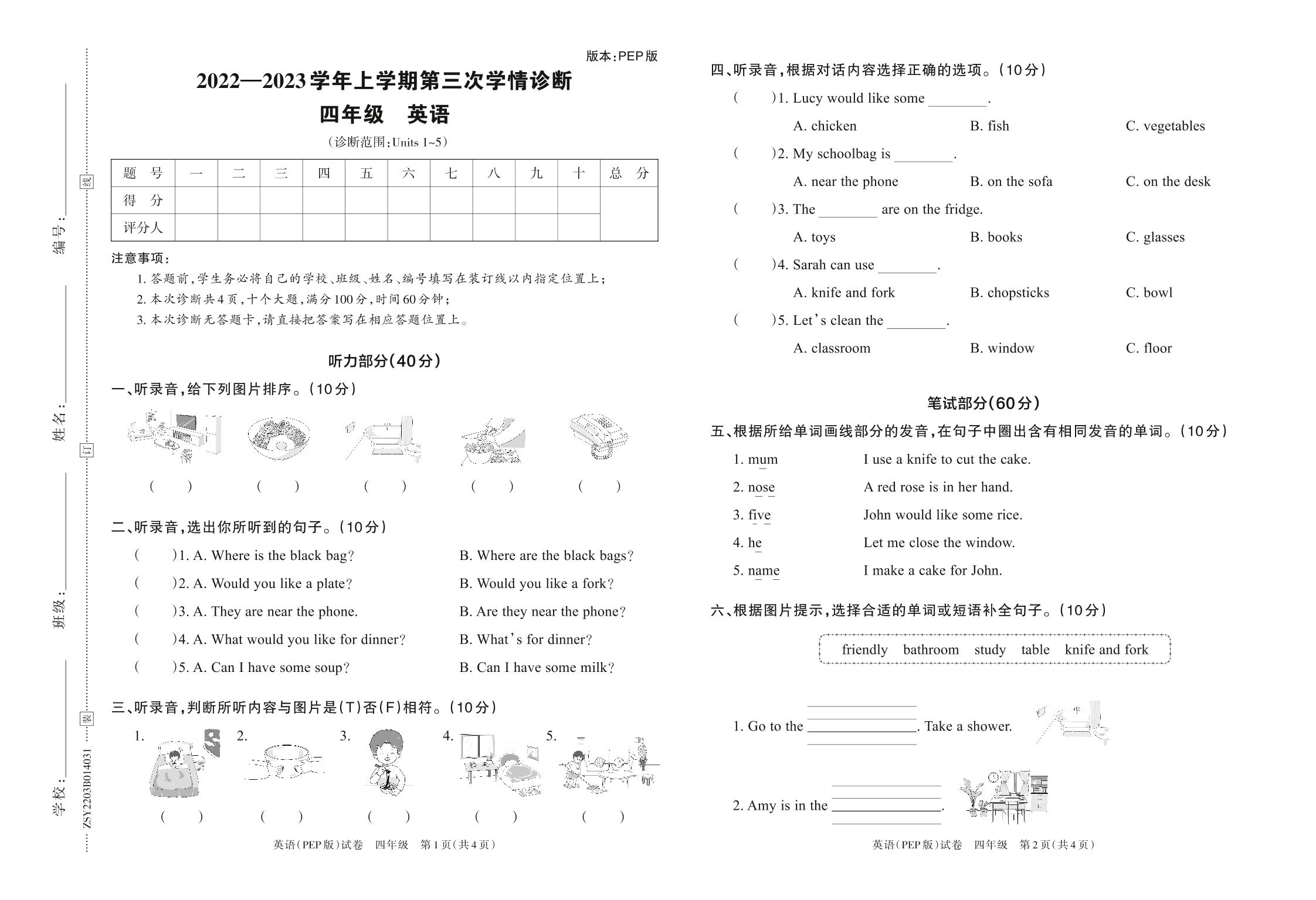 2022—2023学年上学期第三次学情诊断B卷四年级英语(PEP版)