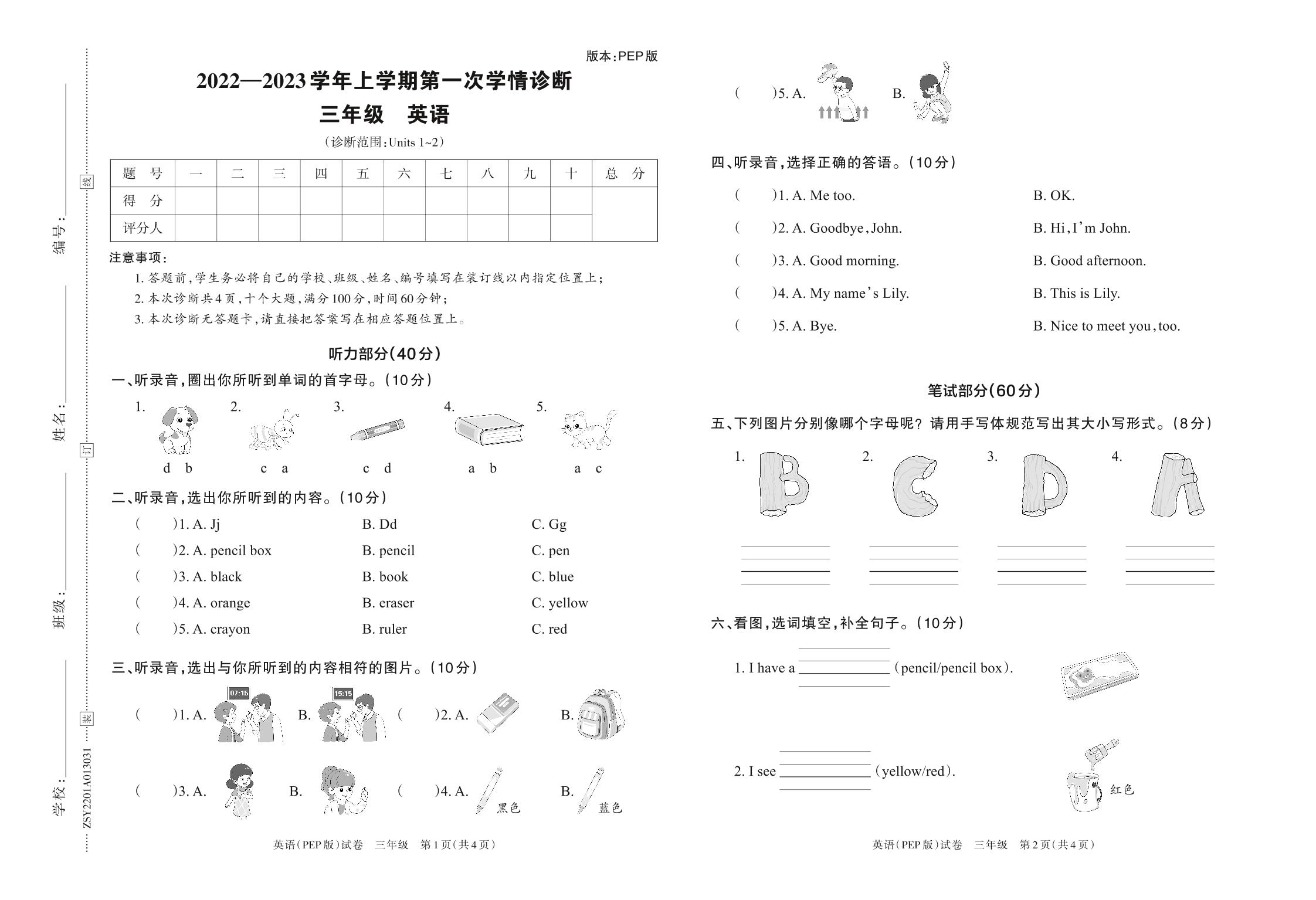 2022—2023学年上学期第一次学情诊断A卷三年级英语(PEP版)