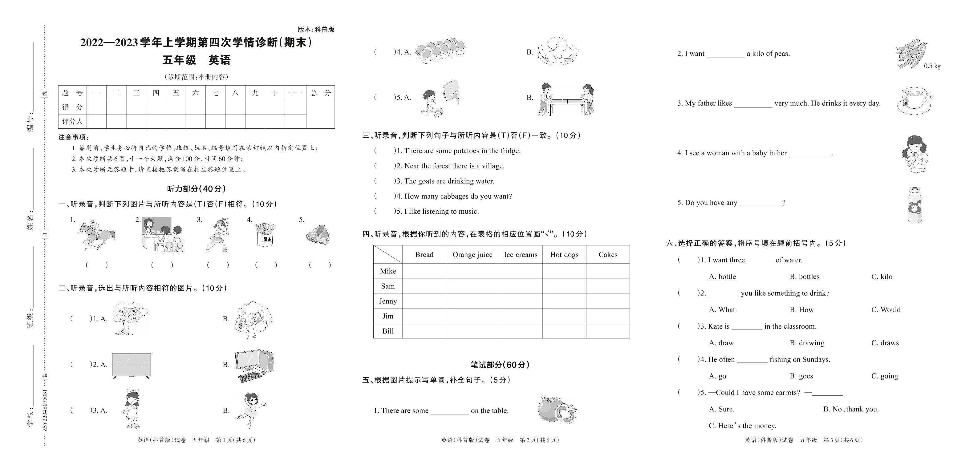 2022—2023学年上学期第四次学情诊断(期末)B卷五年级英语(科普版)