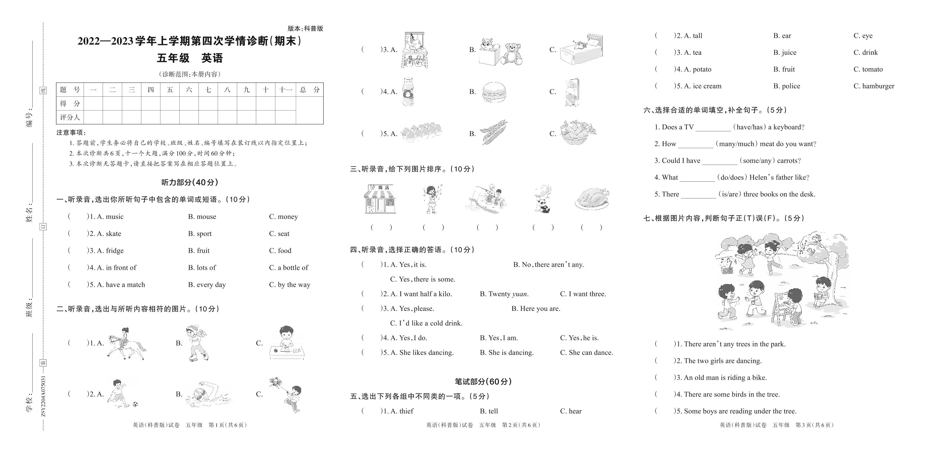 2022—2023学年上学期第四次学情诊断(期末)A卷五年级英语(科普版)