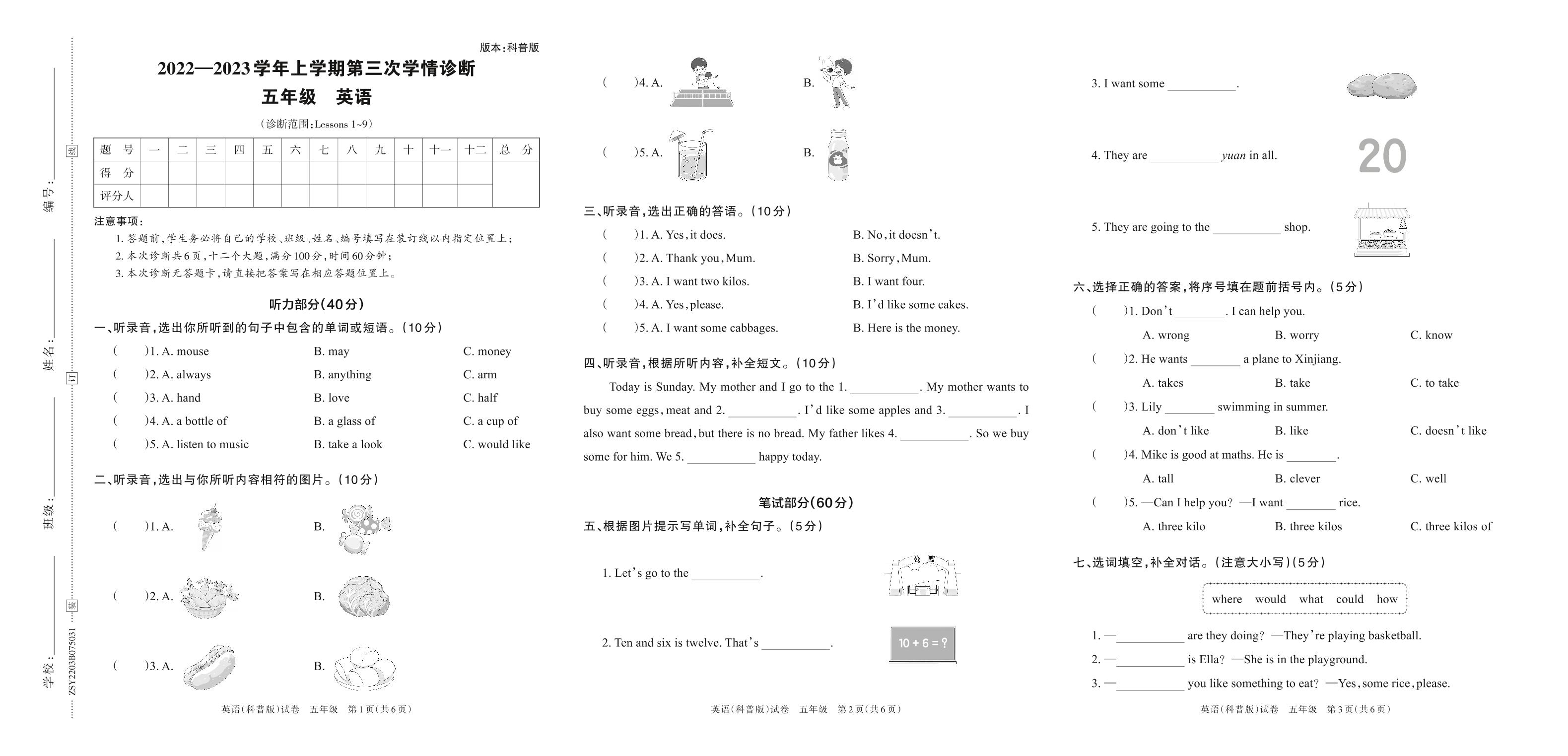 2022—2023学年上学期第三次学情诊断B卷五年级英语(科普版)