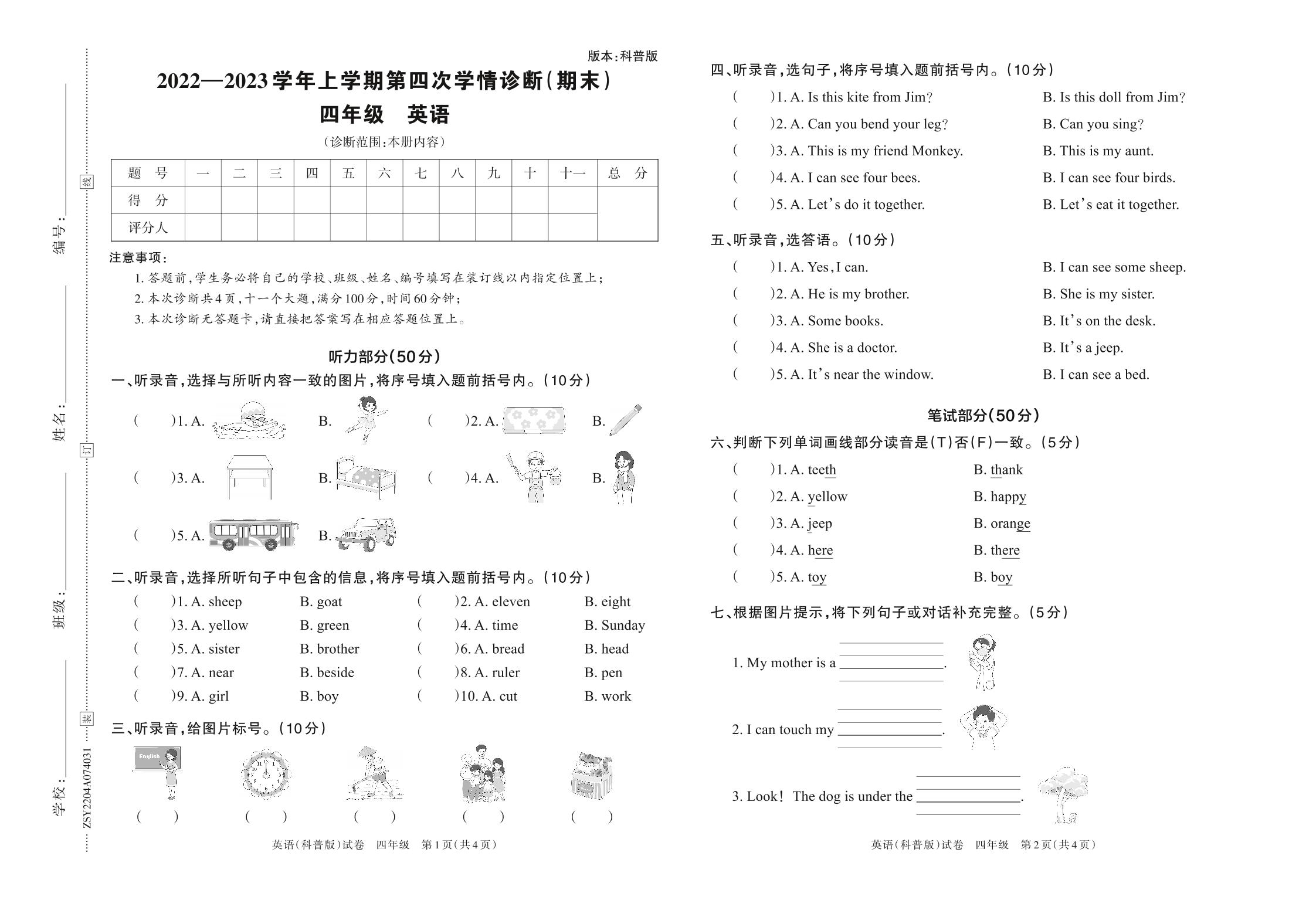 2022—2023学年上学期第四次学情诊断(期末)A卷四年级英语(科普版)