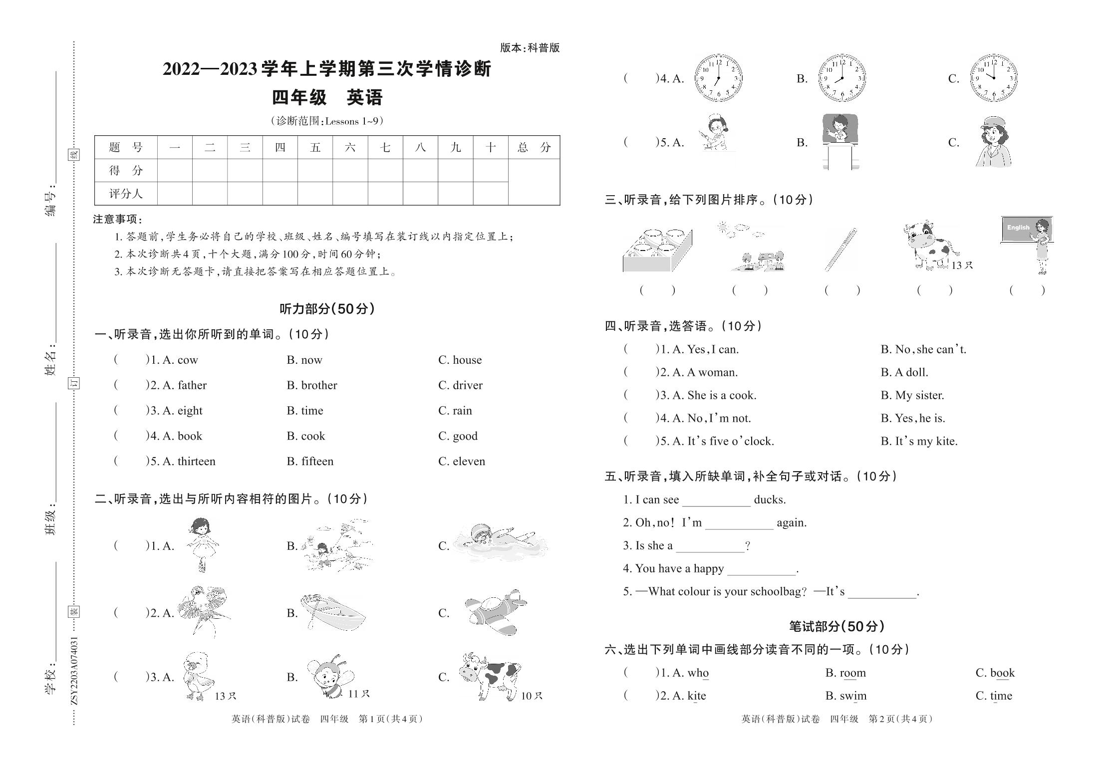 2022—2023学年上学期第三次学情诊断A卷四年级英语(科普版)