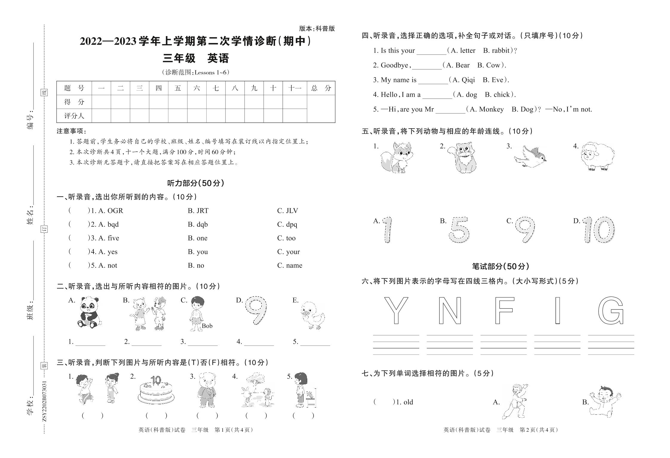 2022—2023学年上学期第二次学情诊断(期中)B卷三年级英语(科普版)