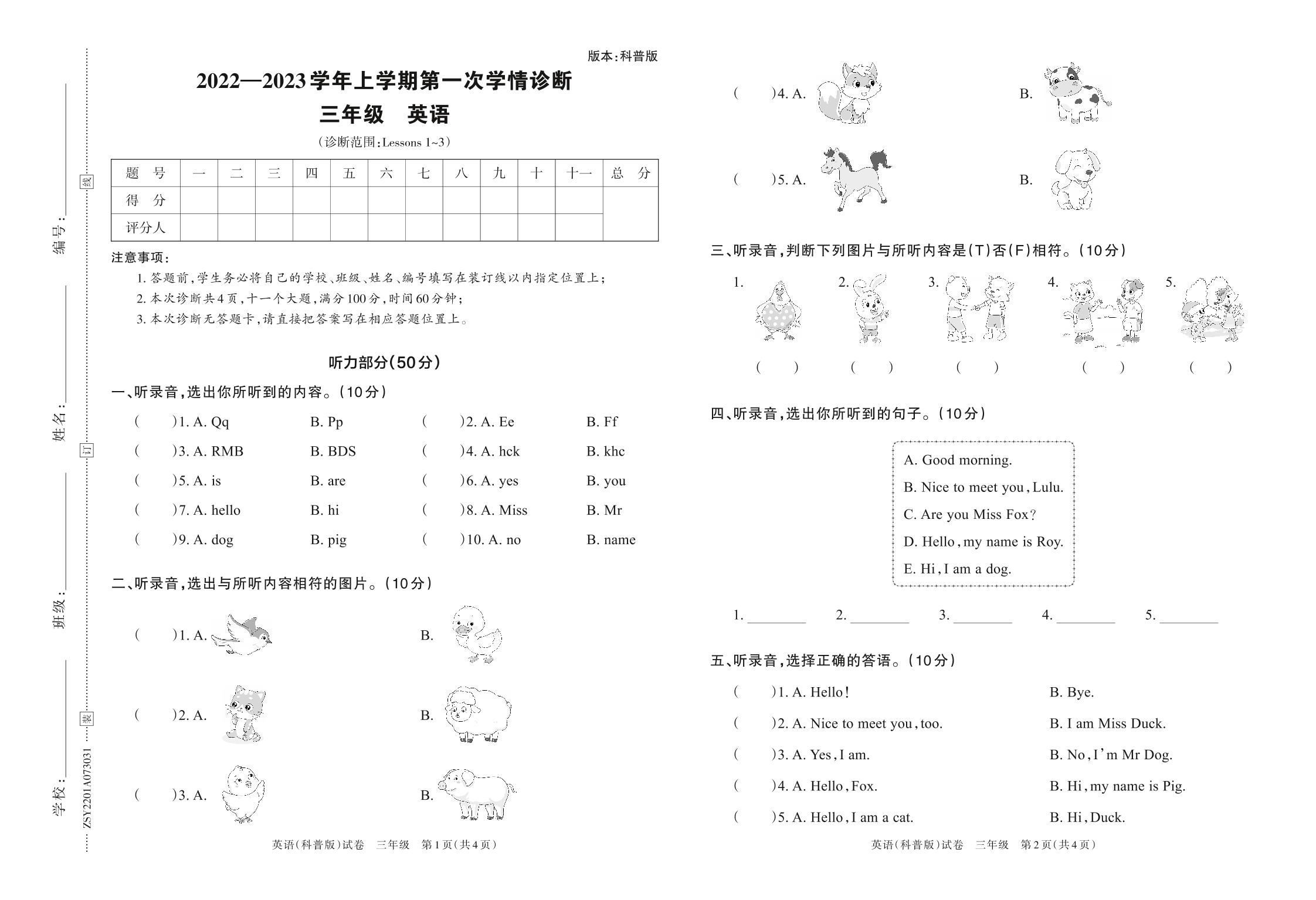2022—2023学年上学期第一次学情诊断A卷三年级英语(科普版)