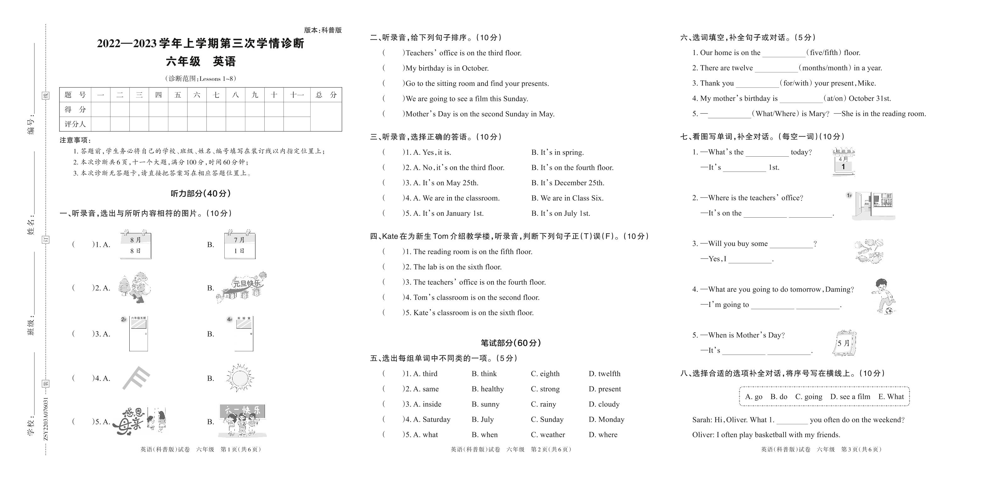 2022—2023学年上学期第三次学情诊断A卷六年级英语(科普版)
