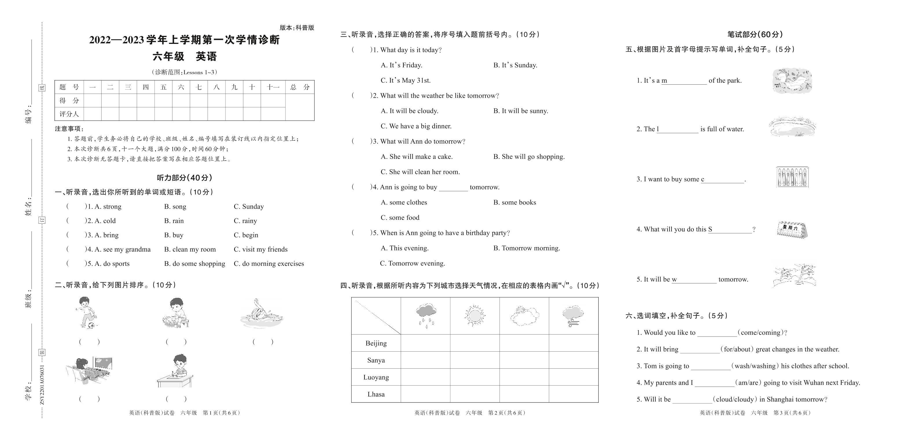 2022—2023学年上学期第一次学情诊断A卷六年级英语(科普版)