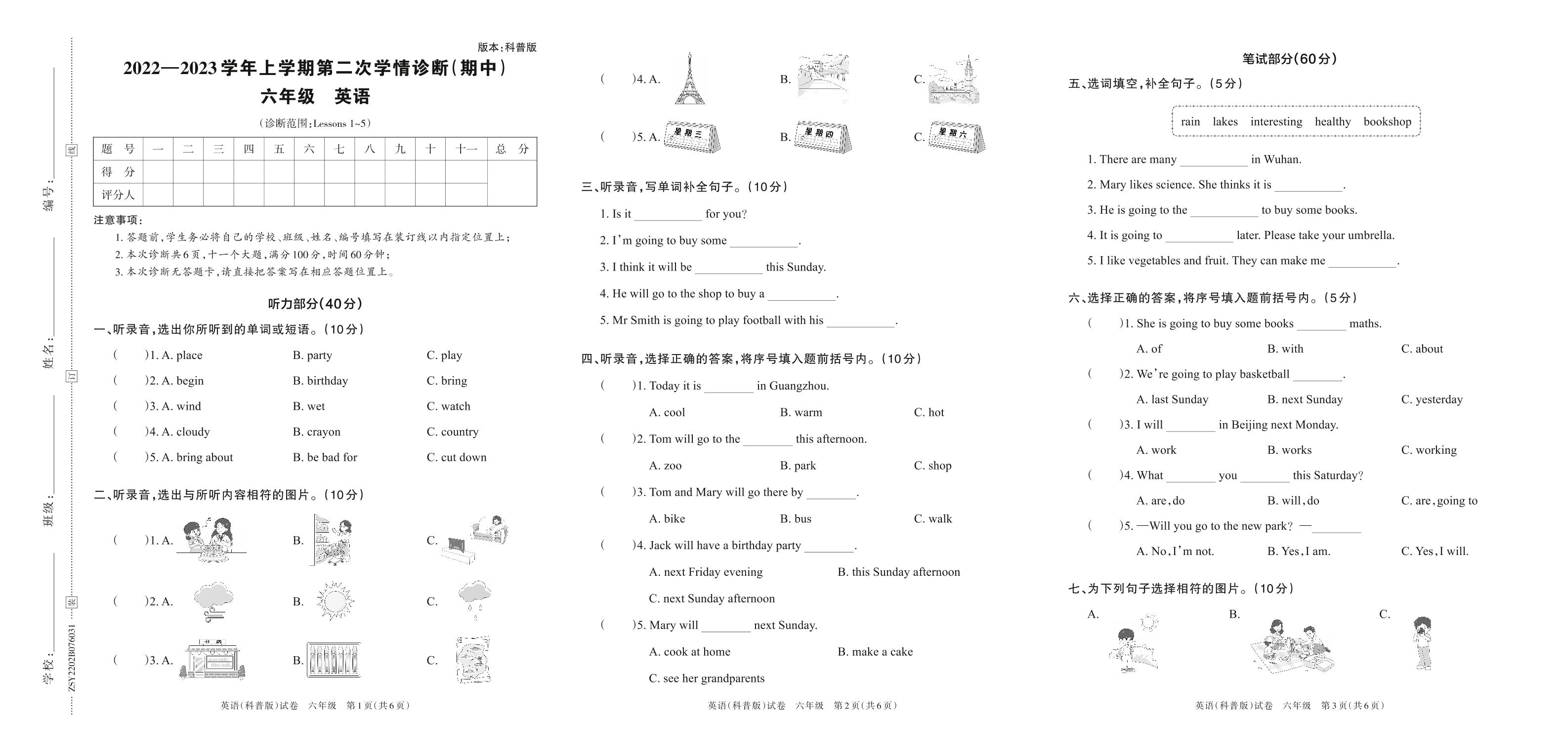 2022—2023学年上学期第二次学情诊断(期中)B卷六年级英语(科普版)