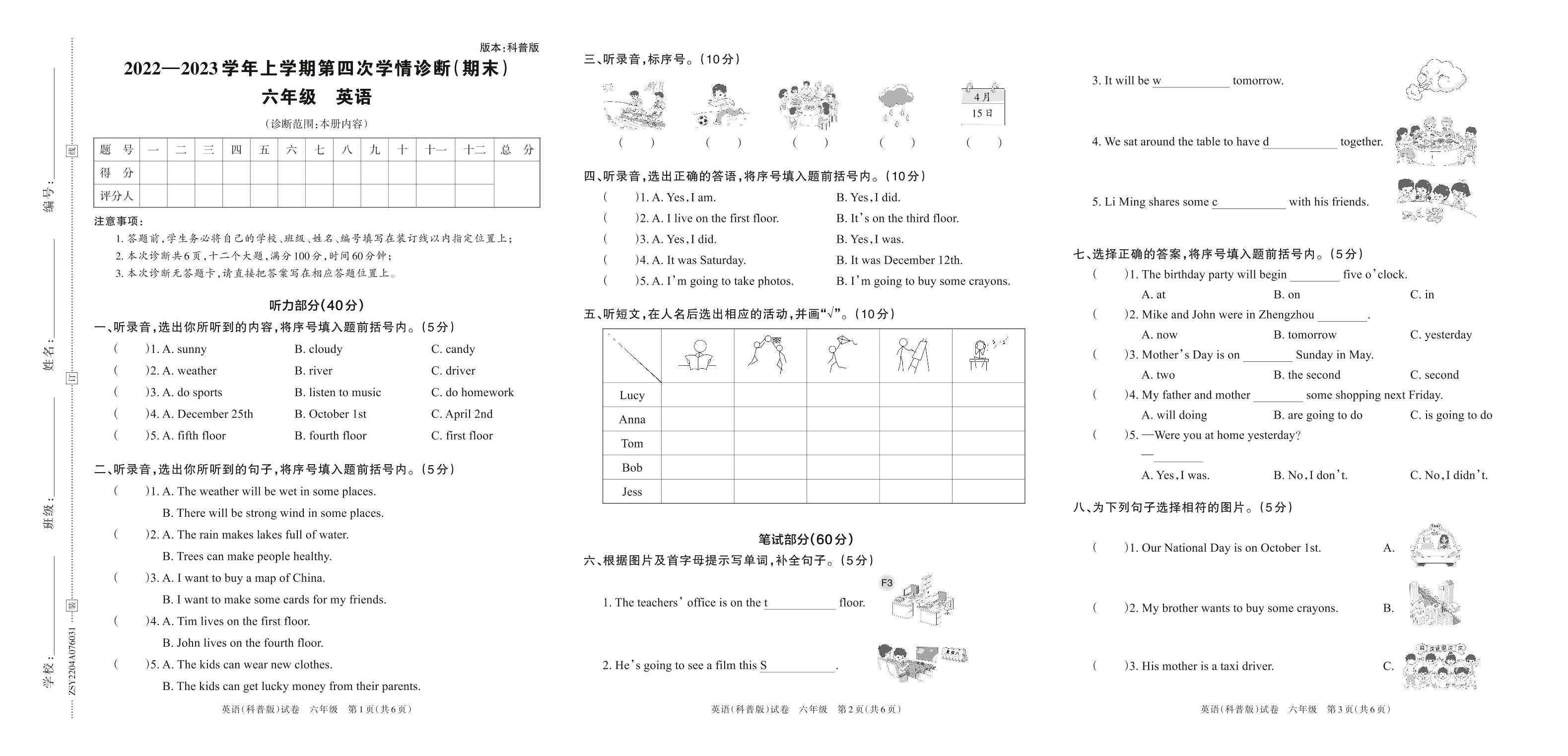 2022—2023学年上学期第四次学情诊断(期末)A卷六年级英语(科普版)