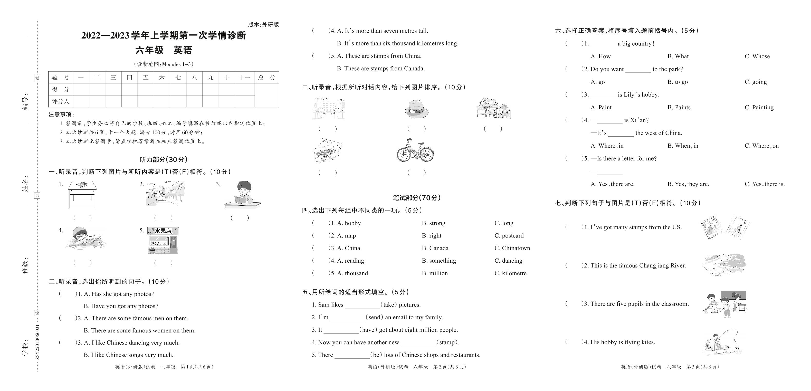 六年级英语外研版(三起始)上册月考卷