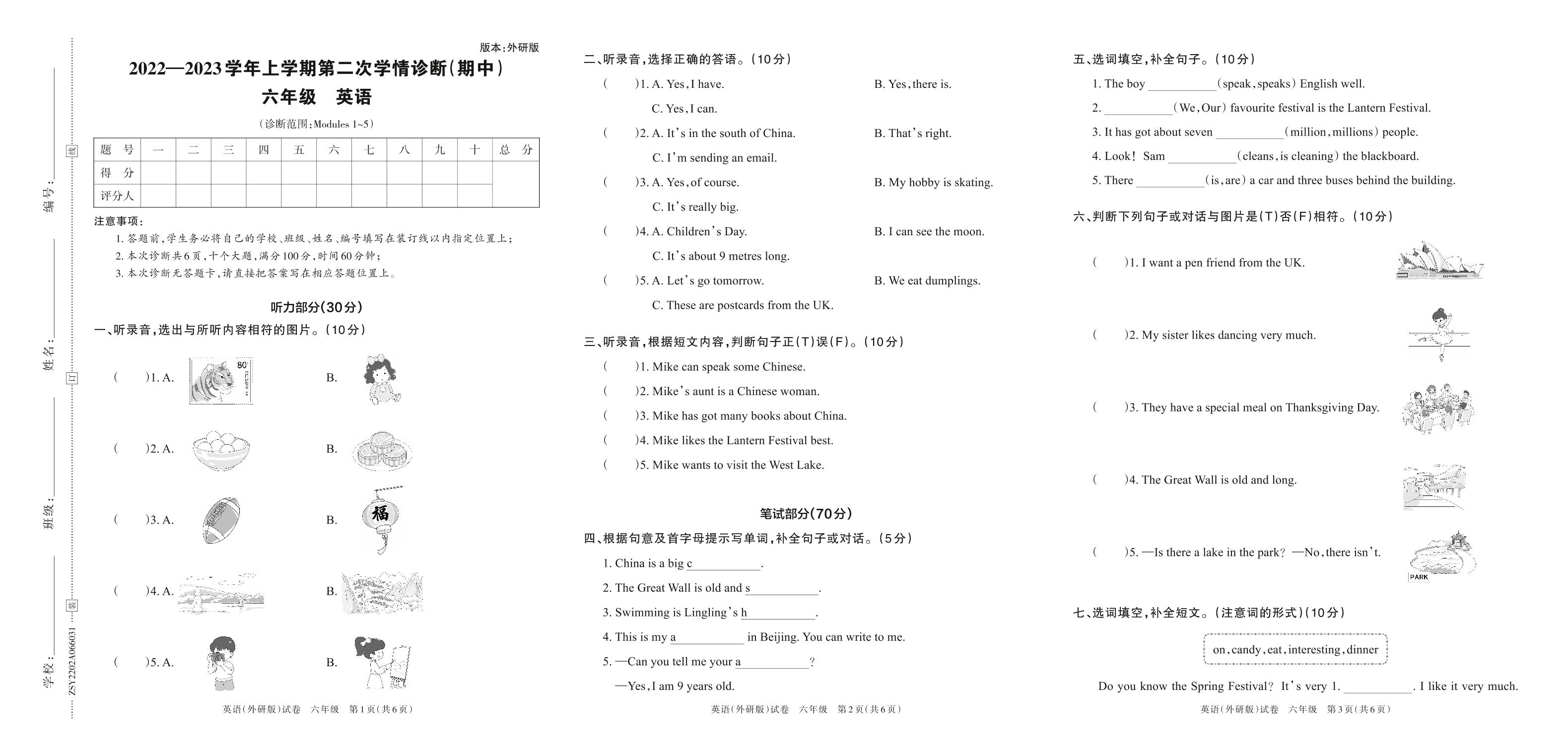 2022—2023学年上学期第二次学情诊断(期中)A卷六年级英语(外研版)