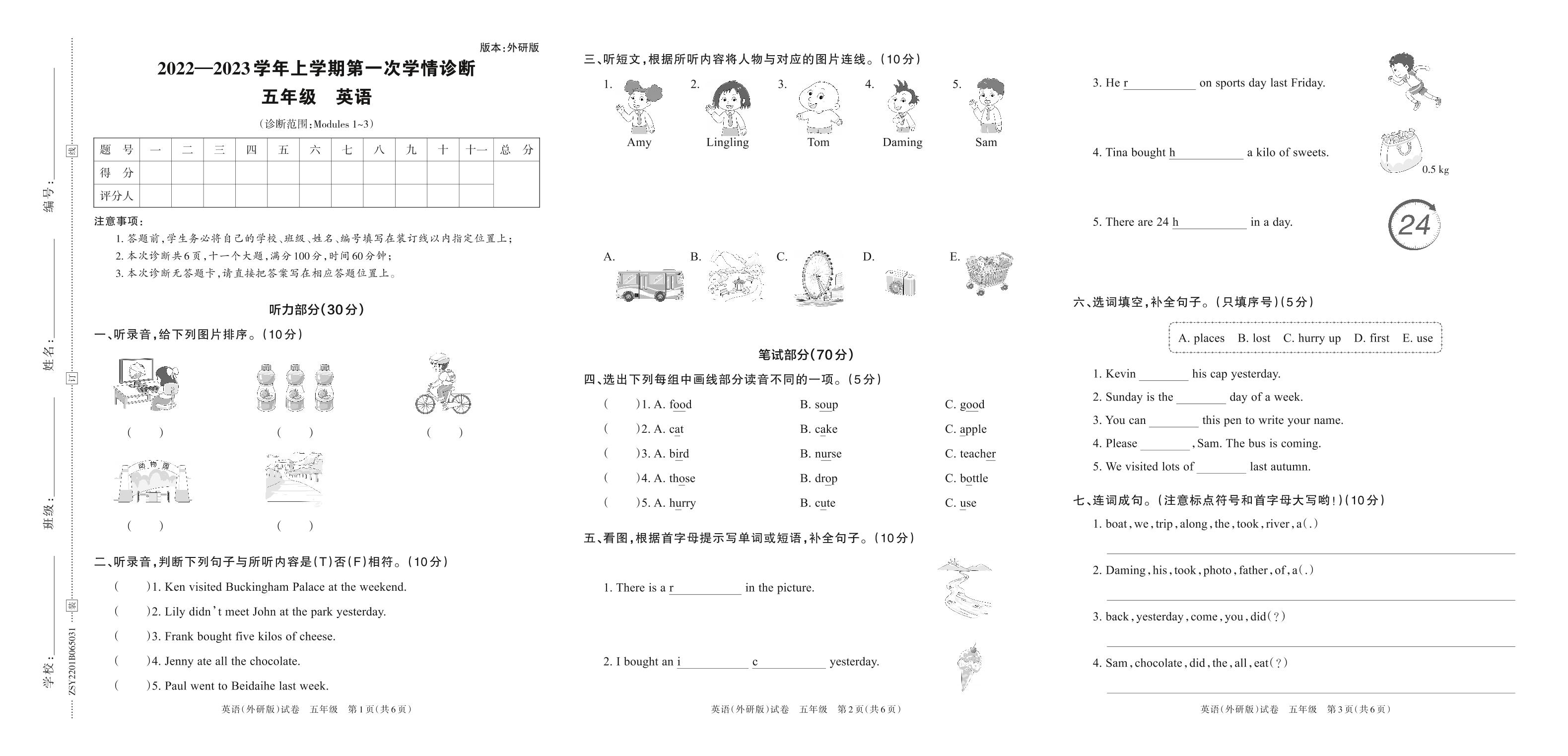 2022—2023学年上学期第一次学情诊断B卷五年级英语(外研版)