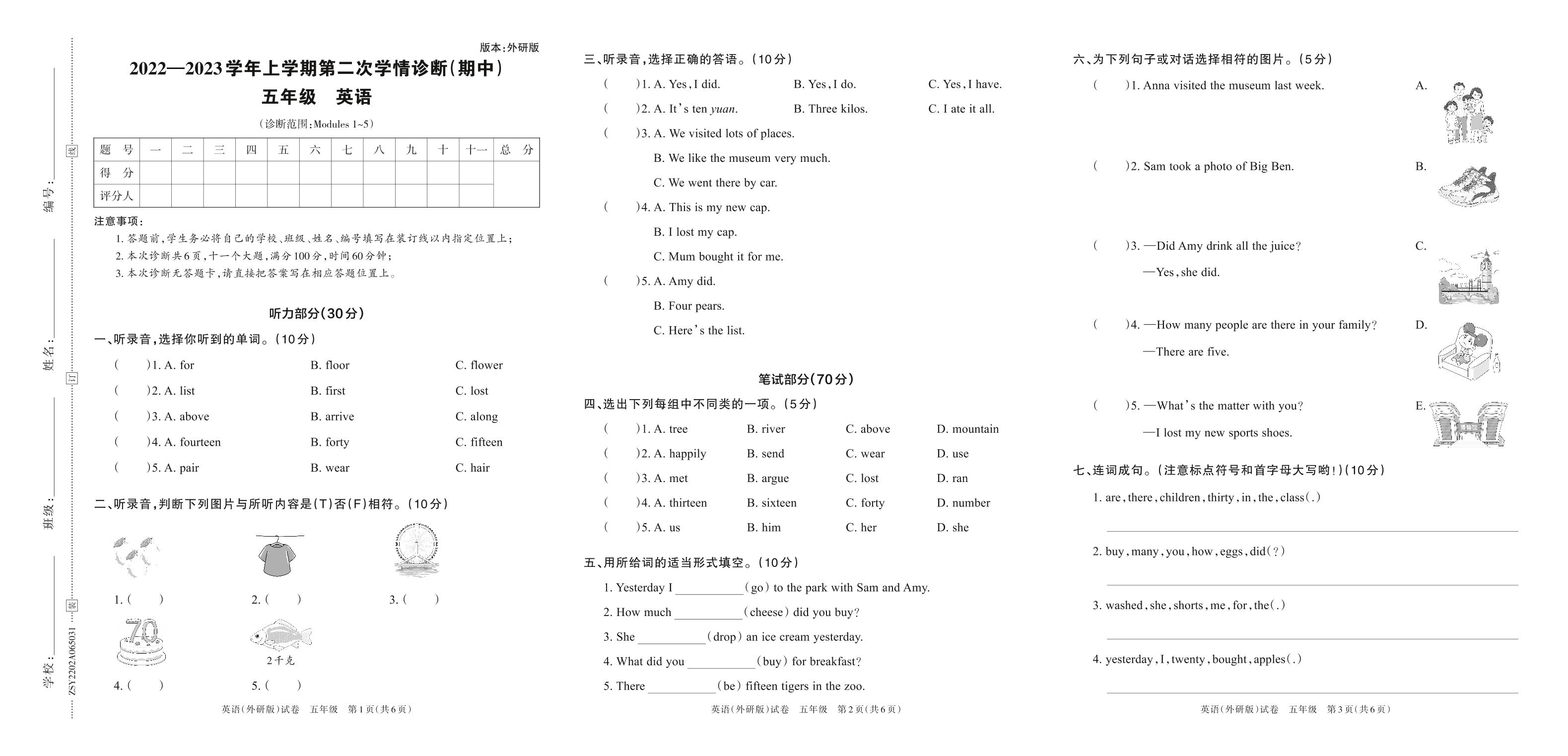 2022—2023学年上学期第二次学情诊断(期中)A卷五年级英语(外研版)