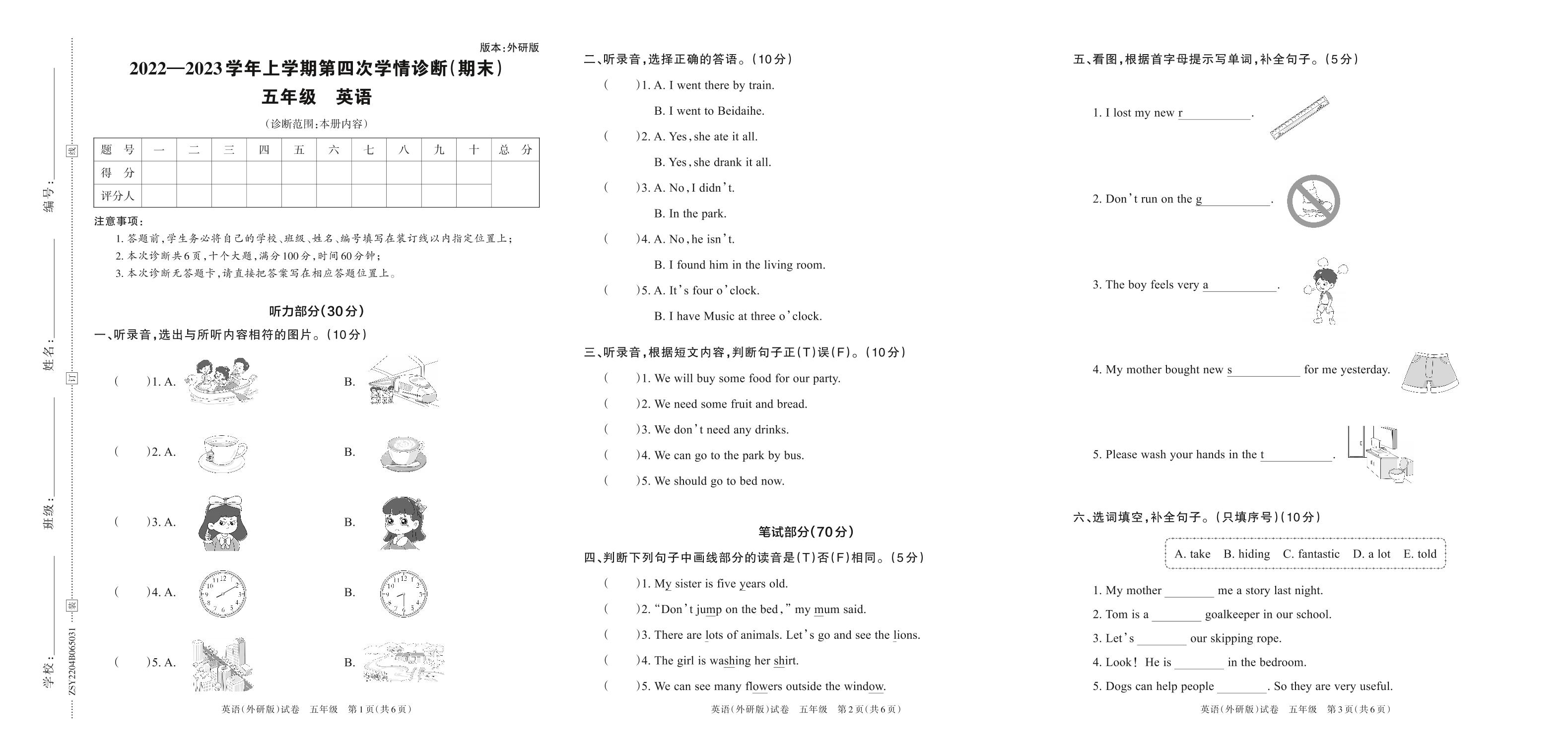 2022—2023学年上学期第四次学情诊断(期末)B卷五年级英语(外研版)