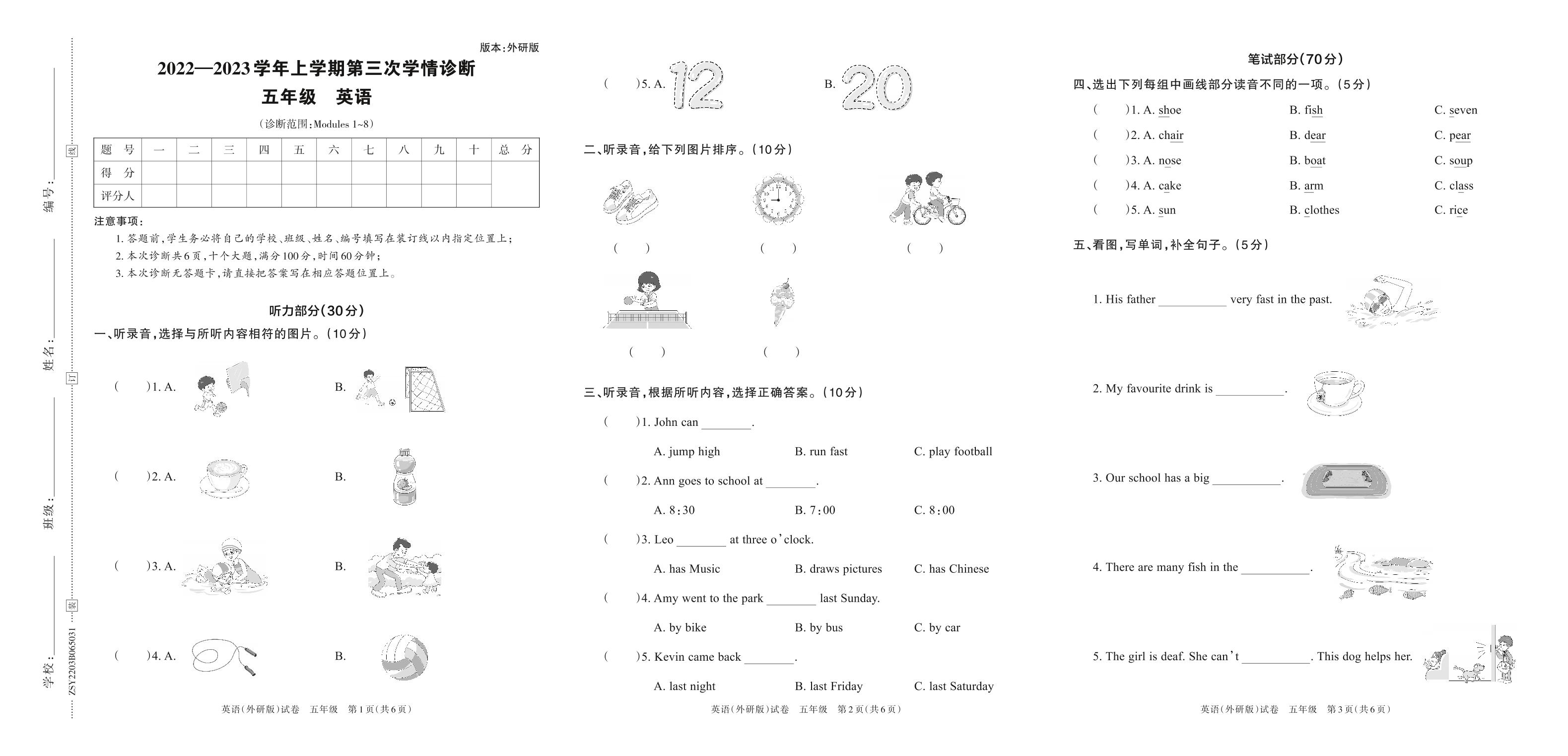 2022—2023学年上学期第三次学情诊断B卷五年级英语(外研版)