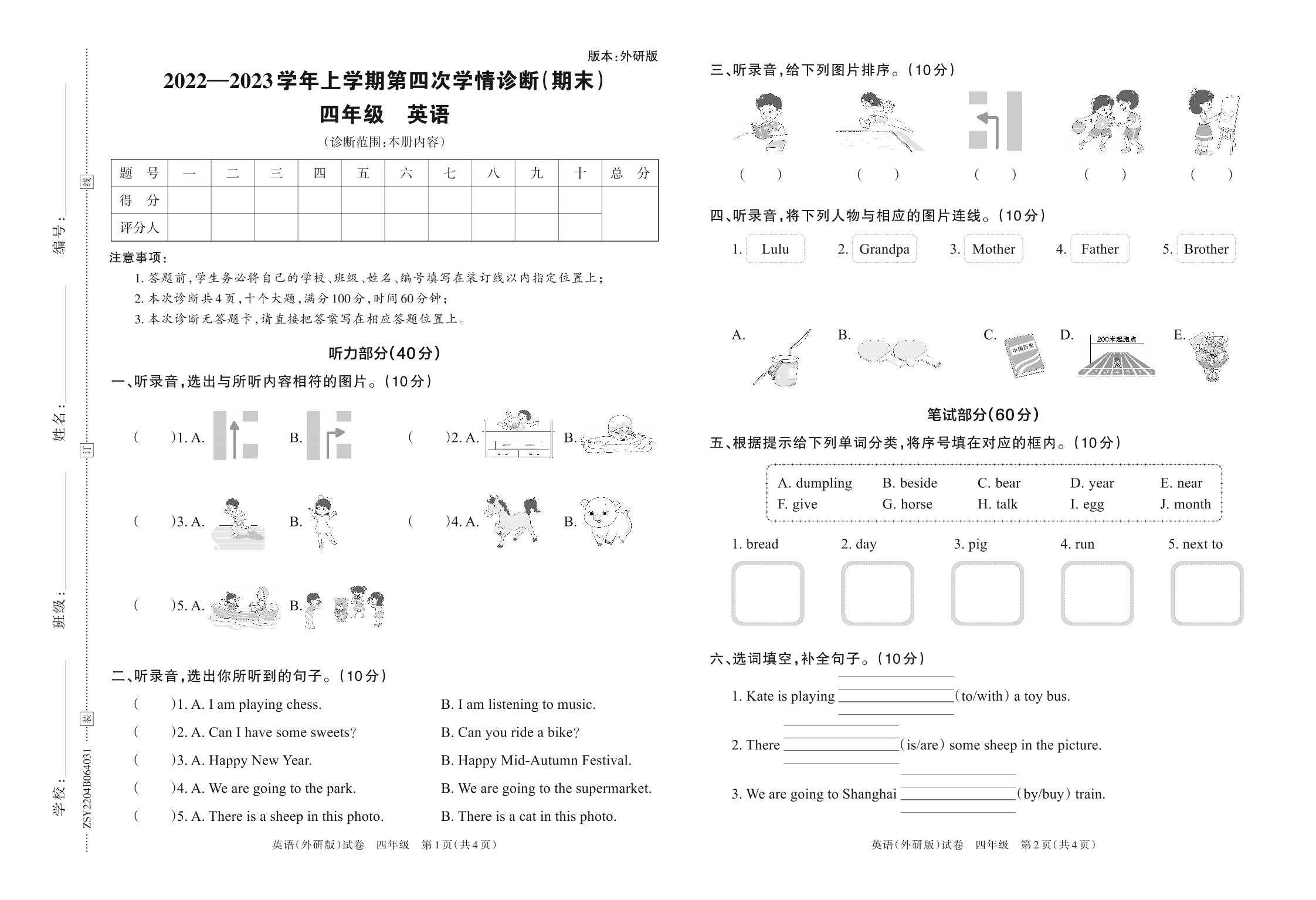 四年级英语外研版(三起始)上册期末卷