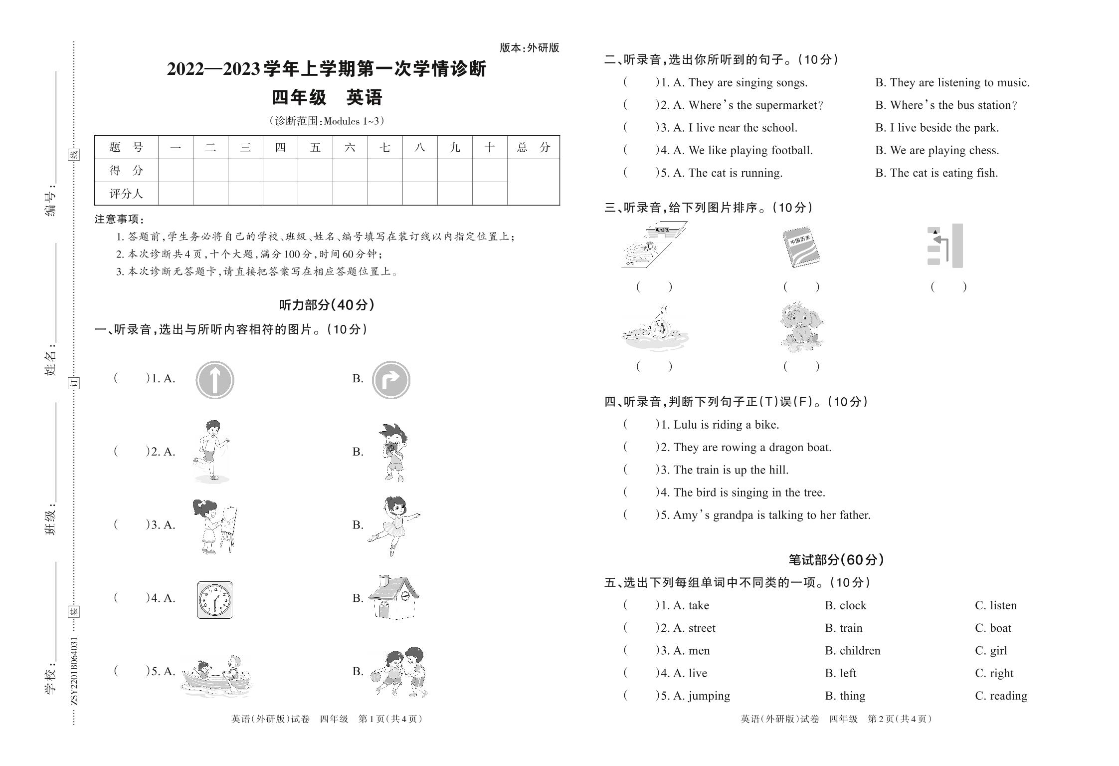 2022—2023学年上学期第一次学情诊断B卷四年级英语(外研版)