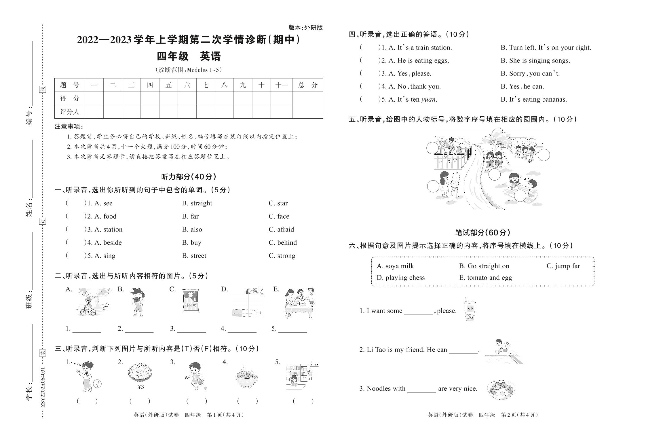 2022—2023学年上学期第二次学情诊断(期中)A卷四年级英语(外研版)