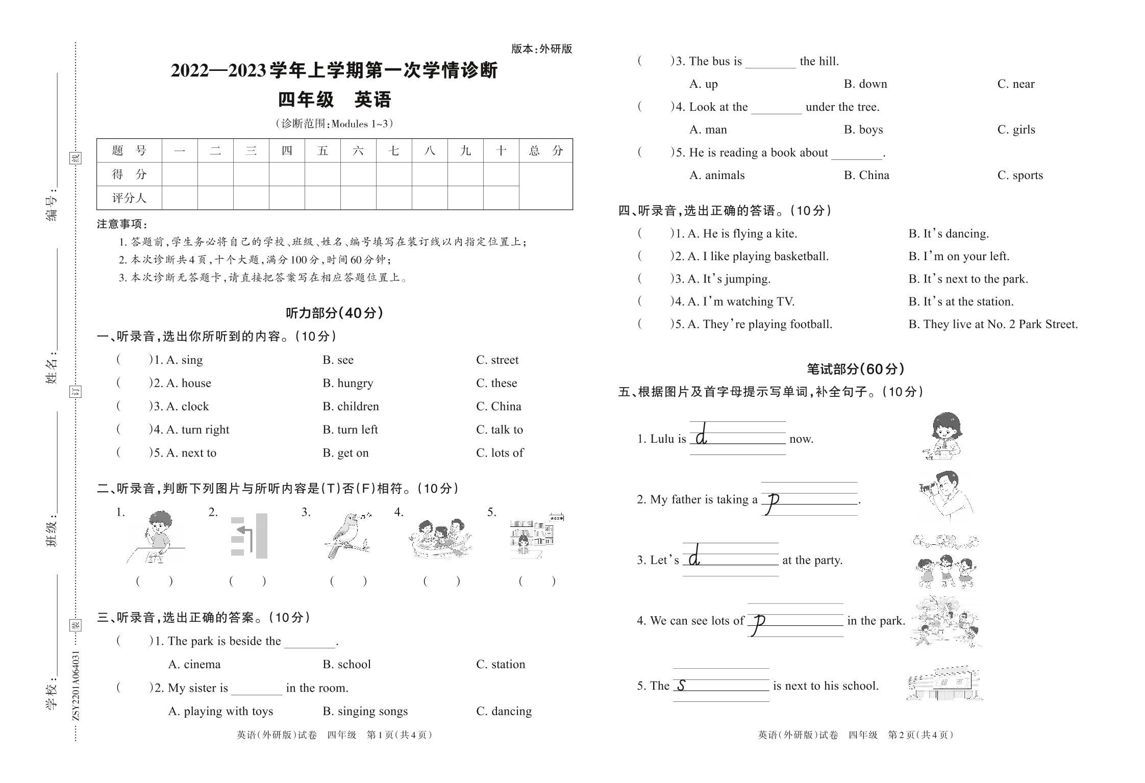 2022—2023学年上学期第一次学情诊断A卷四年级英语(外研版)