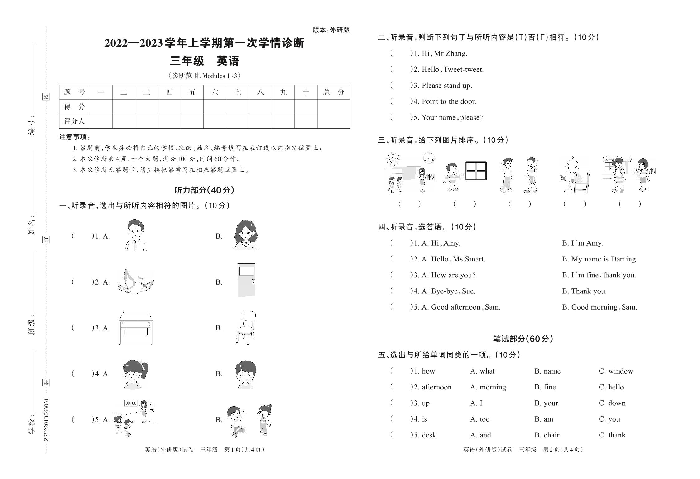 2022—2023学年上学期第一次学情诊断B卷三年级英语(外研版)