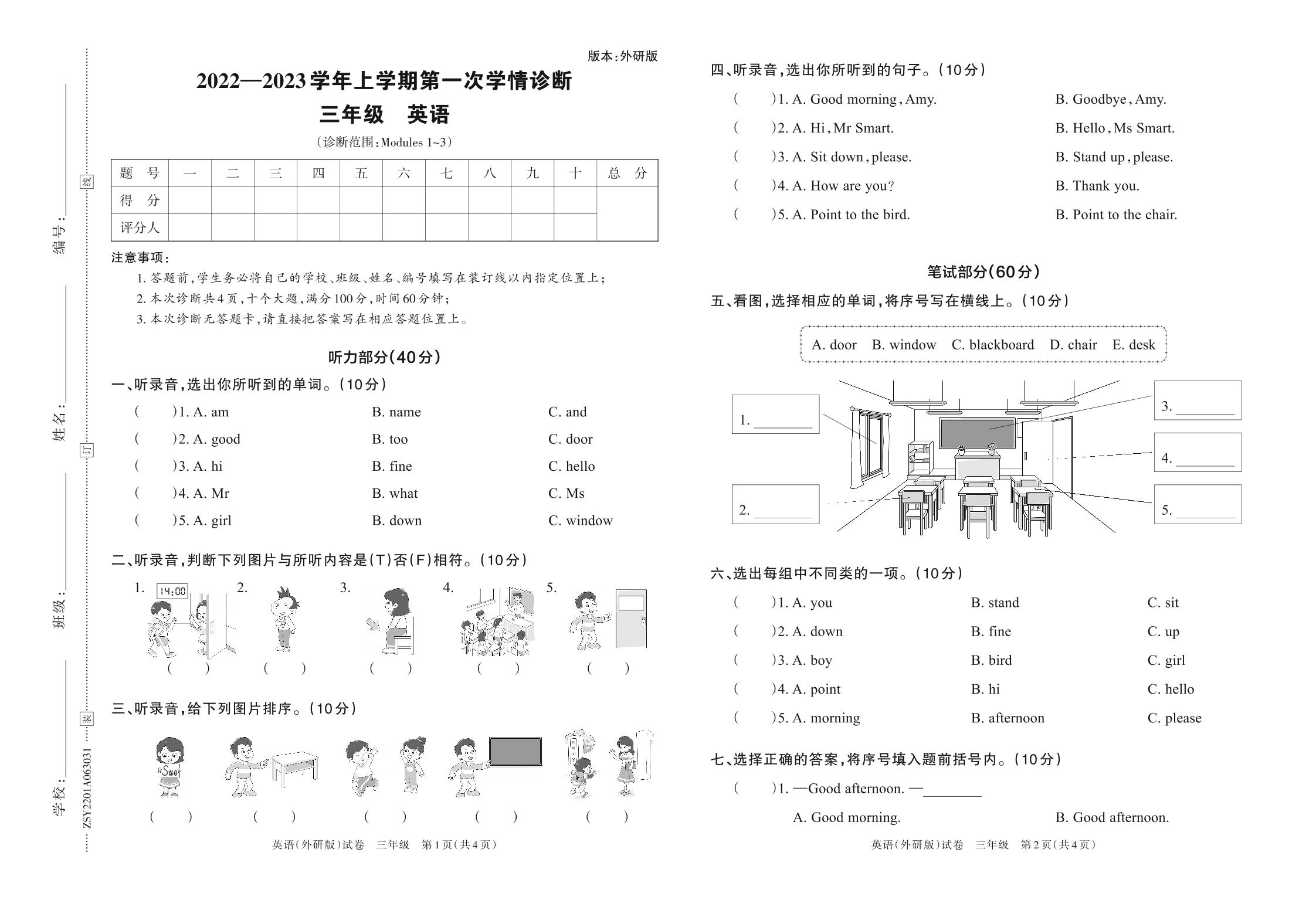 2022—2023学年上学期第一次学情诊断A卷三年级英语(外研版)