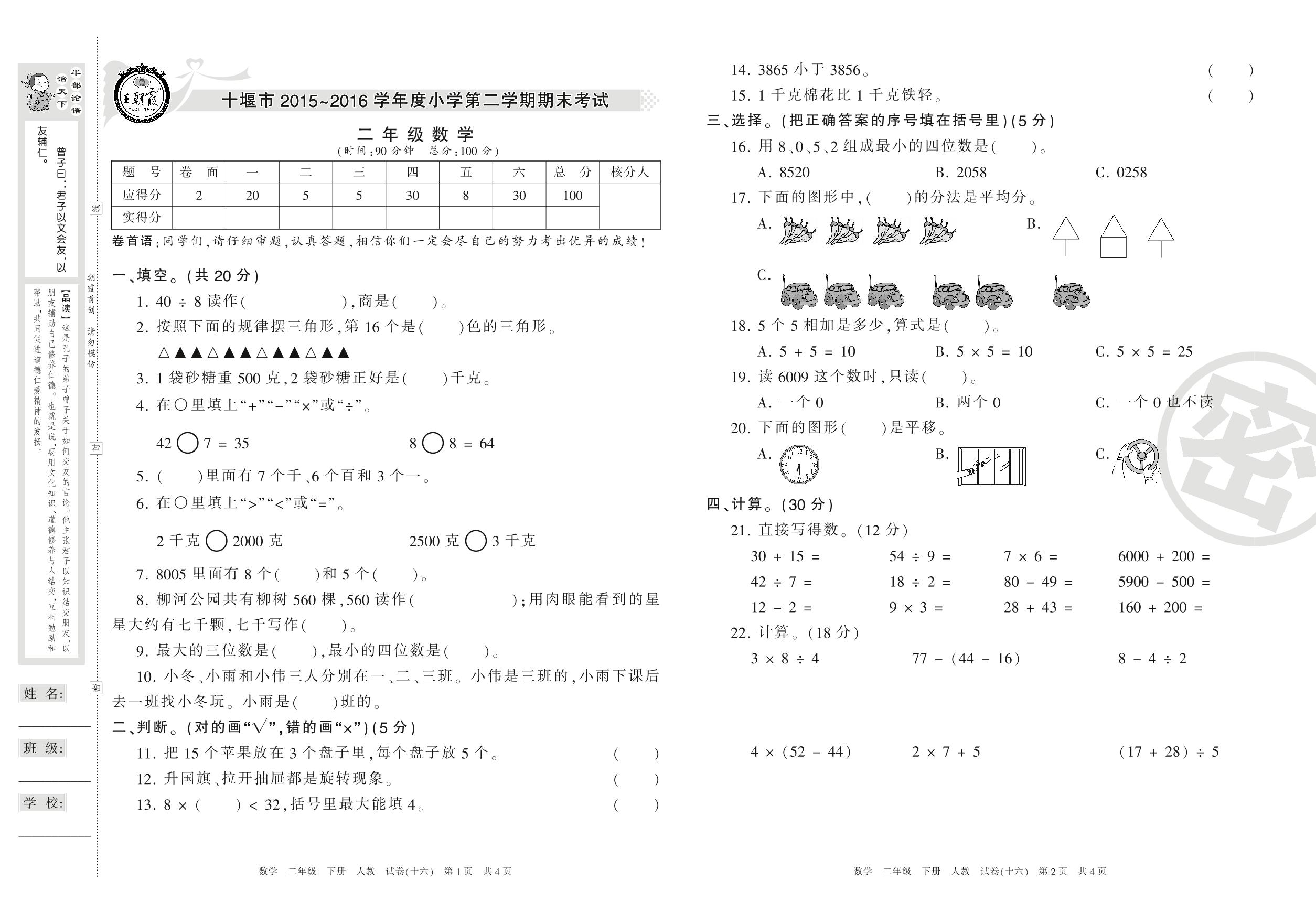 2015-2016学年第二学期十堰市二年级数学试卷(人教版)【16】