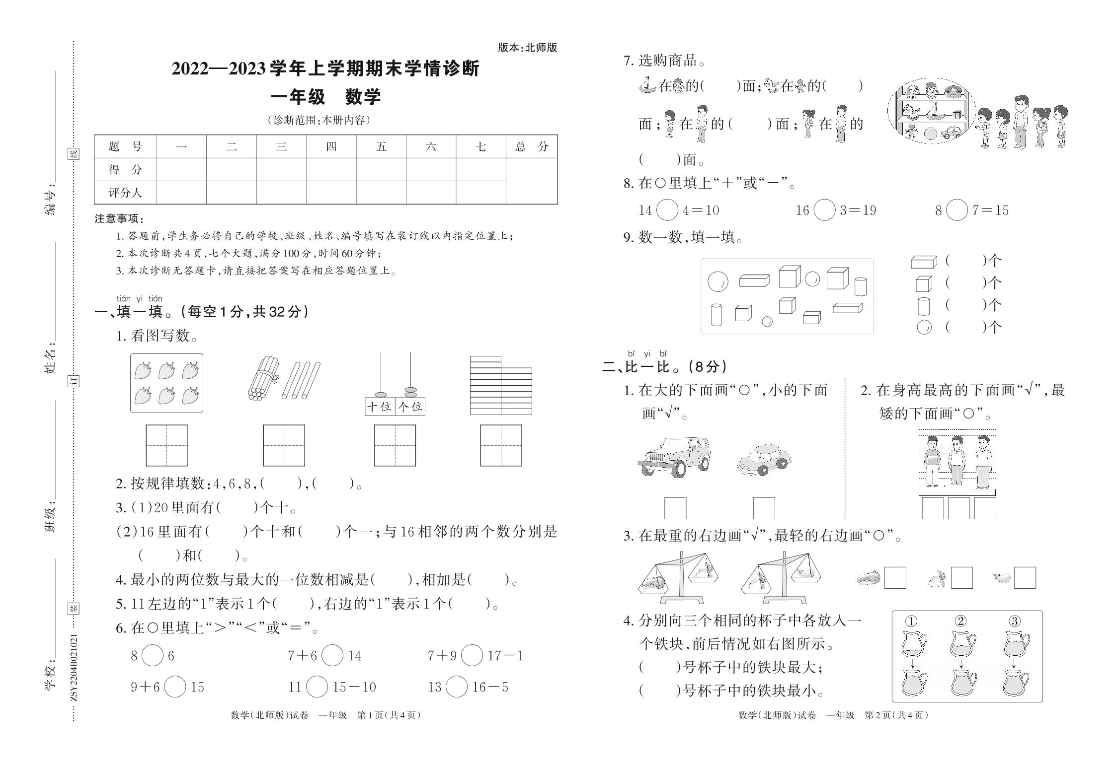 2022—2023学年上学期期末学情诊断B卷一年级数学(北师版)