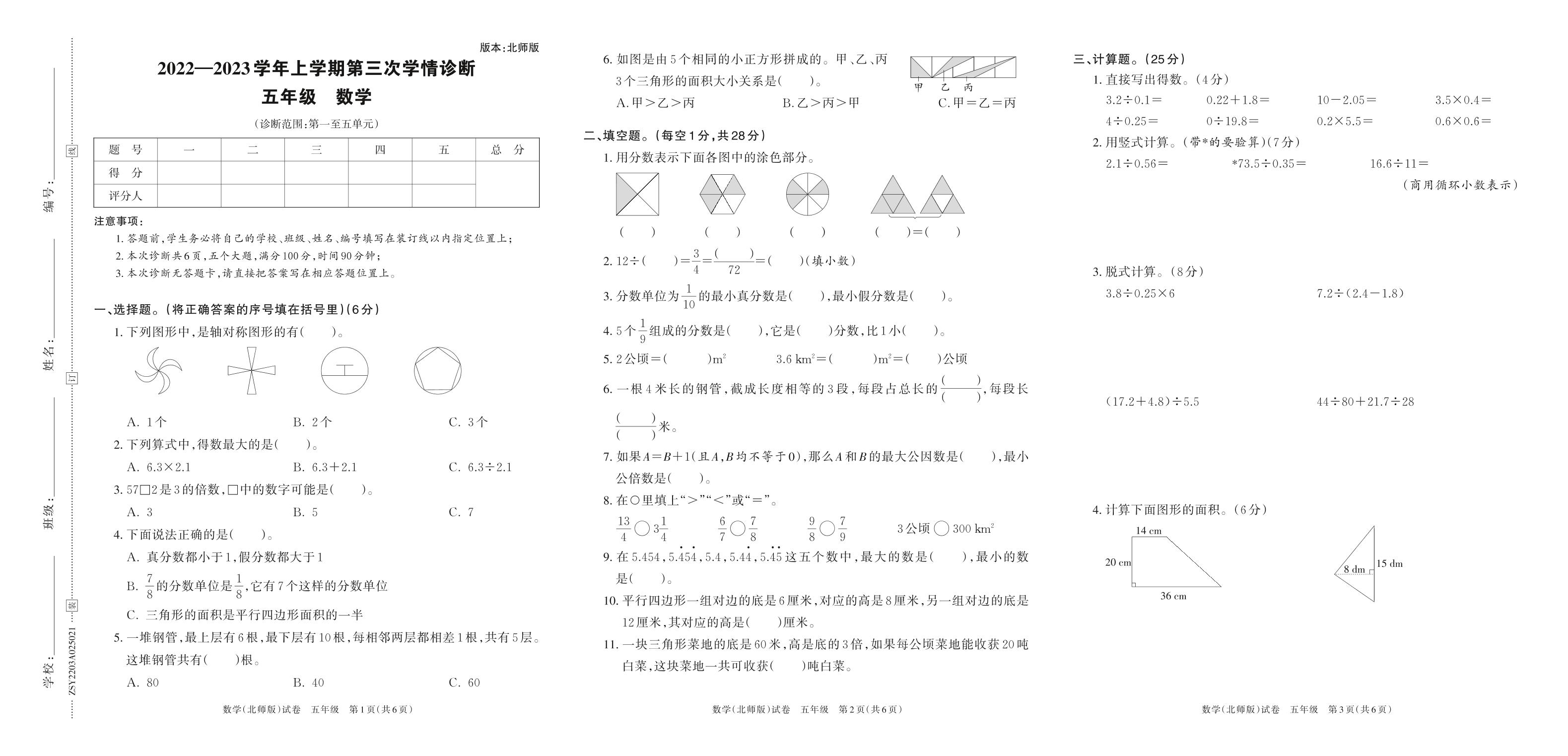 2022—2023学年上学期第三次学情诊断A卷五年级数学(北师版)