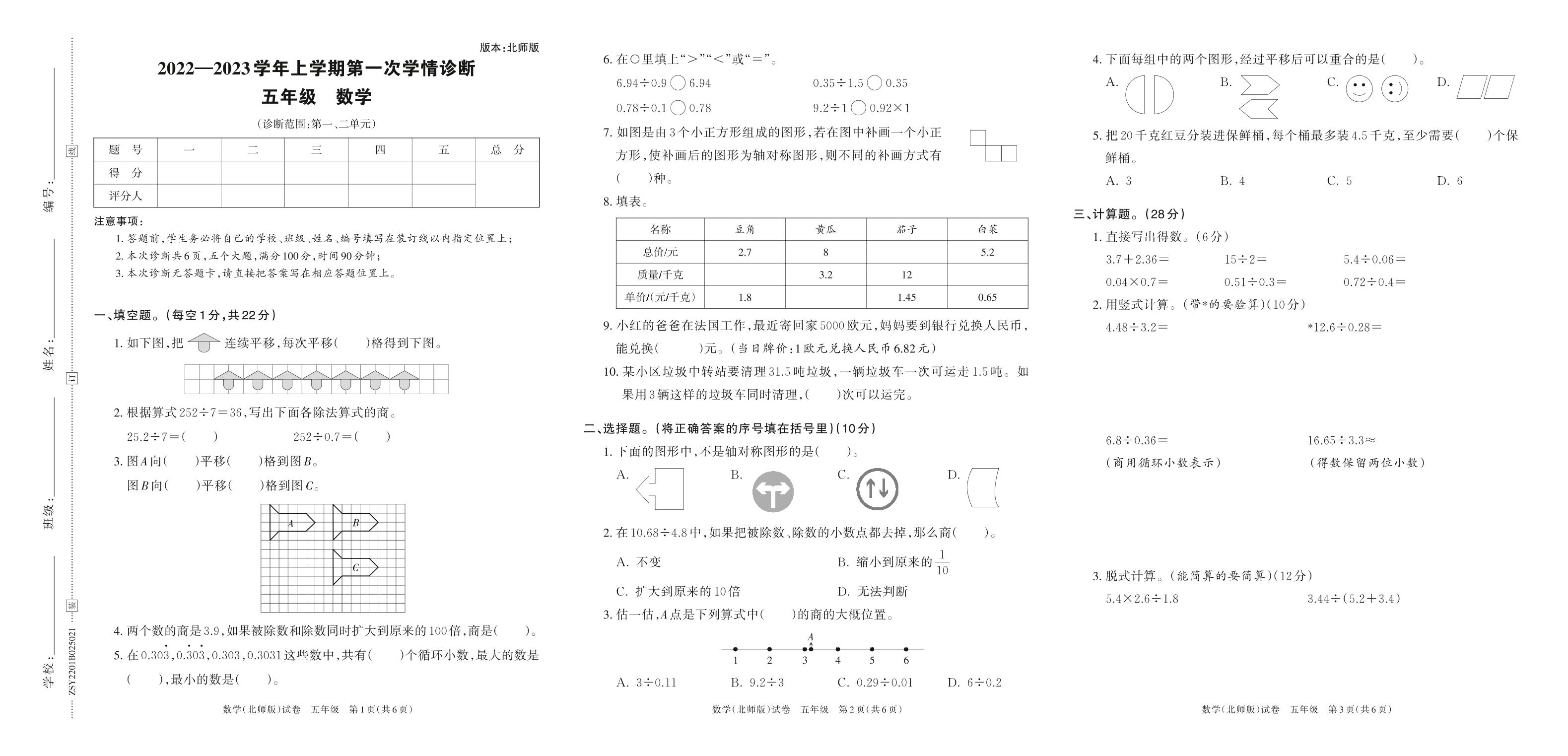 2022—2023学年上学期第一次学情诊断B卷五年级数学(北师版)