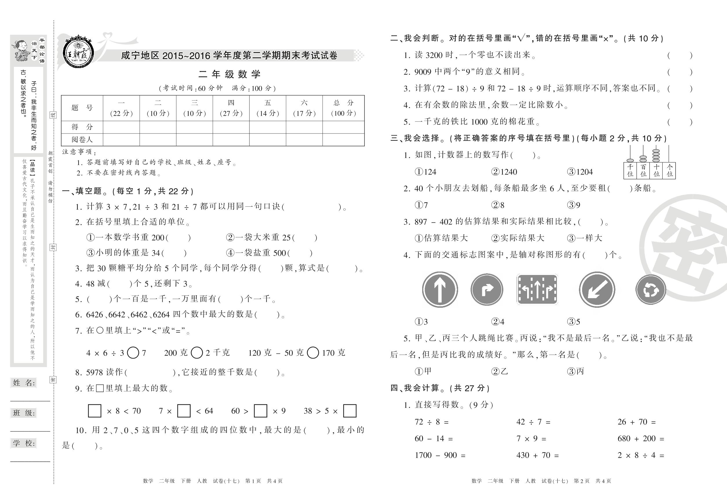 2015-2016学年第二学期咸宁市咸宁地区二年级数学试卷(人教版)【17】