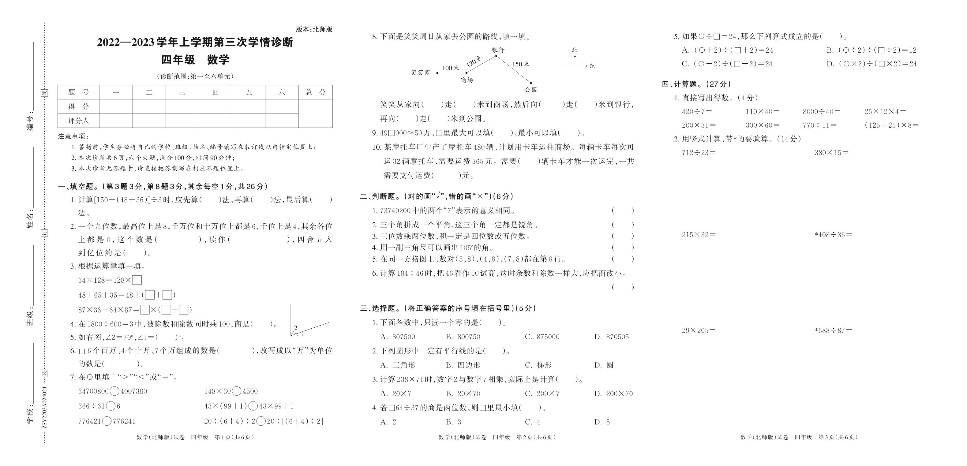 2022—2023学年上学期第三次学情诊断A卷四年级数学(北师版)
