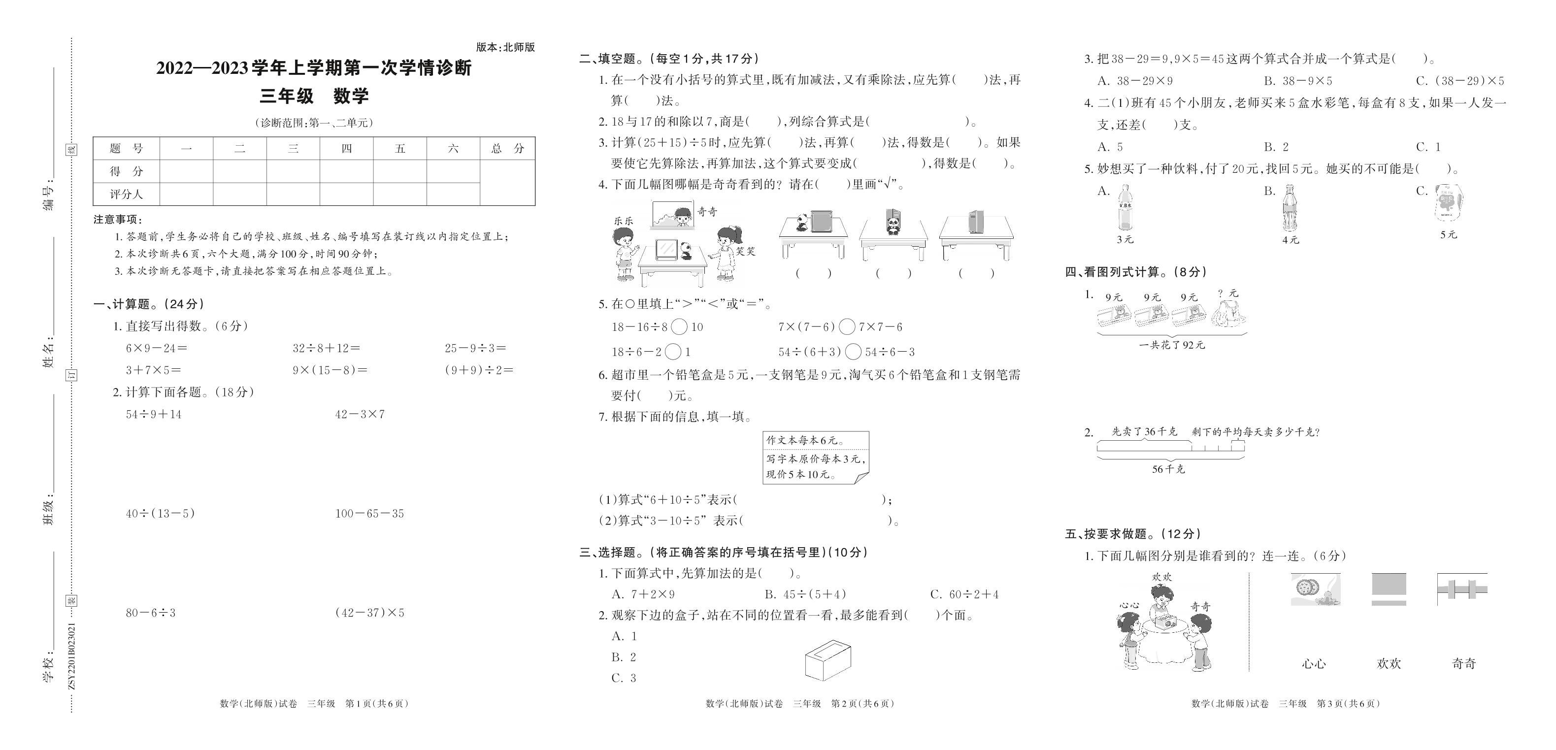 2022—2023学年上学期第一次学情诊断B卷三年级数学(北师版)